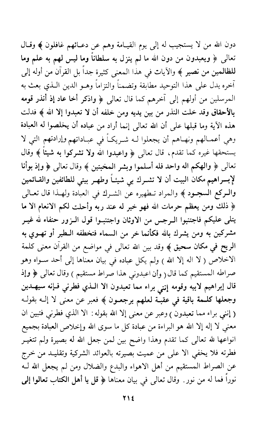 دُونِ اللَّهِ مَنْ لاَ يَسْتَجِيبُ لَهُ إِلَى يَوْمِ الْقِيَامَةِ وَهُمْ عَنْ دُعَائِهِمْ غَافِلُونَ} وقال تعالى: {وَيَعْبُدُونَ مِنْ دُونِ اللَّهِ مَا لَمْ يُنَزِّلْ بِهِ سُلْطَانًا وَمَا لَيْسَ لَهُمْ بِهِ عِلْمٌ وَمَا لِلظَّالِمِينَ مِنْ نَصِيرٍ} والآيات في هذا المعنى كثيرة جدا بل القرآن من أوله إلى آخره يدل على هذا التوحيد مطابقة وتضمنا والتزاما وهو الدين الذي بعث به المرسلين من أولهم إلى آخرهم كما قال تعالى: {وَاذْكُرْ أَخَا عَادٍ إِذْ أَنْذَرَ قَوْمَهُ بِالأَحْقَافِ وَقَدْ خَلَتْ النُّذُرُ مِنْ بَيْنِ يَدَيْهِ وَمِنْ خَلْفِهِ أَلاَّ تَعْبُدُوا إِلاَّ اللَّهَ} فدلت هذه الآية وما قبلها على أن الله تعالى إنما أدار من عباده أن يخلصوا له العبادة وهي أعمالهم ونهاهم أن يجعلوا له شريكا في عباداتهم وإرادتهم التي لا يستحقها غيره كما تقدم قال تعالى: {وَاعْبُدُوا اللَّهَ وَلاَ تُشْرِكُوا بِهِ شَيْئًا} وقال تعالى: {فَإِلَهُكُمْ إِلَهٌ وَاحِدٌ فَلَهُ أَسْلِمُوا وَبَشِّرْ الْمُخْبِتِينَ} وقال تعالى: {وَإِذْ بَوَّأْنَا ِلأَبْرَاهِيمَ مَكَانَ الْبَيْتِ أَنْ لاَ تُشْرِكْ بِي شَيْئًا وَطَهِّرْ بَيْتِيَ لِلطَّائِفِينَ وَالْقَائِمِينَ وَالرُّكَّعِ السُّجُودِ} والمراد تطهيره عن الشرك في العبادة ولهذا قال تعالى: {ذَلِكَ وَمَنْ يُعَظِّمْ حُرُمَاتِ اللَّهِ فَهُوَ خَيْرٌ لَهُ عِنْدَ رَبِّهِ وَأُحِلَّتْ لَكُمْ الأَنْعَامُ إِلاَّ مَا يُتْلَى عَلَيْكُمْ فَاجْتَنِبُوا الرِّجْسَ مِنْ الأَوْثَانِ وَاجْتَنِبُوا قَوْلَ الزُّورِ حُنَفَاءَ لِلَّهِ غَيْرَ مُشْرِكِينَ بِهِ وَمَنْ يُشْرِكْ بِاللَّهِ فَكَأَنَّمَا خَرَّ مِنْ السَّمَاءِ فَتَخْطَفُهُ الطَّيْرُ أَوْ تَهْوِي بِهِ الرِّيحُ فِي مَكَانٍ سَحِيقٍ} وقد بين الله تعالى في مواضع من القرآن معنى كلمة الإخلاص "لا إله إلا الله" ولم يكل عباده في بيان معناها إلى أحد سواه وهو صراطه المستقيم كما قال "وأن اعبدوني هذا صراط المستقيم" وقال تعالى: {وَإِذْ قَالَ إِبْرَاهِيمُ ِلأَبِيهِ وَقَوْمِهِ إِنَّنِي بَرَاءٌ مِمَّا تَعْبُدُونَ*إِلاَّ الَّذِي فَطَرَنِي فَإِنَّهُ سَيَهْدِينِ*وَجَعَلَهَا كَلِمَةً بَاقِيَةً فِي عَقِبِهِ لَعَلَّهُمْ يَرْجِعُونَ} فعبر عن لا إله بقوله: "إنني براء مما تعبدون" وعبر عن معنى إلا الله بقوله: إلا الذي فطرني فتبين أن معني لا إله إلا الله هو البراءة من عبادة كل ما سوى الله وإخلاص العبادة بجميع أنواعها لله تعالى كما تقدم وهذا واضح بين لمن جعل الله له بصيرة ولم تتغير فطرته فلا يخفى إلا على من عميت بصيرته بالعوائد الشركية وتقليد من خرج عن الصراط المستقيم من أهل الأهواء والبدع والضلال ومن لم يجعل الله له نورا فما له من نور. وقال تعالى: في بيان معناها {قُلْ يَا أَهْلَ الْكِتَابِ تَعَالَوْا إِلَى