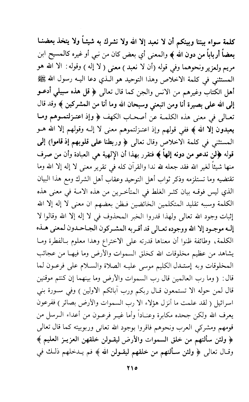 كَلِمَةٍ سَوَاءٍ بَيْنَنَا وَبَيْنَكُمْ أَلاَّ نَعْبُدَ إِلاَّ اللَّهَ وَلاَ نُشْرِكَ بِهِ شَيْئًا وَلاَ يَتَّخِذَ بَعْضُنَا بَعْضًا أَرْبَابًا مِنْ دُونِ اللَّه} ِ والمعنى أي بعض كان من نبي أو غيره كالمسيح ابن مريم ولعزير ونحوهما وفي قوله: {أَلاَّ نَعْبُدَ} معنى "لا إله" وقوله: إلا الله هو المستثنى في كلمة الإخلاص وهذا التوحيد هو الذي دعا إليه رسول الله صلى الله عليه وسلم أهل الكتاب وغيرهم من الإنس والجن كما قال تعالى: {قُلْ هَذِهِ سَبِيلِي أَدْعُو إِلَى اللَّهِ عَلَى بَصِيرَةٍ أَنَا وَمَنْ اتَّبَعَنِي وَسُبْحَانَ اللَّهِ وَمَا أَنَا مِنْ الْمُشْرِكِينَ} وقد قال تعالى: في معنى هذه الكلمة عن أصحاب الكهف {وَإِذْ اعْتَزَلْتُمُوهُمْ وَمَا يَعْبُدُونَ إِلاَّ اللَّهَ} ففي قولهم: وإذ اعتزلتموهم معنى لا إله وقولهم: إلا الله المستثني في كلمة الإخلاص وقال تعالى: {وَرَبَطْنَا عَلَى قُلُوبِهِمْ إِذْ قَامُوا} إلى قوله: {لَنْ نَدْعُوَ مِنْ دُونِهِ إِلَهًا} فتقرر بهذه أن الإلهية هي العبادة وأن من صرف منها شيئا من لغير الله قد جعله لله ندا والقرآن كله في تقرير معنى لا إله إلا الله وما تقتضيه وما تستلزمه وذكر ثواب أهل التوحيد وعقاب أهل الشرك ومع هذا البيان الذي ليس فوقه بيان كثر الغلط في المتأخرين من هذه الأمة في معنى هذه الكلمة وسببه تقليد المتكلمين الخائضين فظن بعضهم إن معنى لا إله إلا الله إثبات وجود الله تعالى ولهذا قدروا الخبر المحذوف في لا إله إلا الله إله موجود إلا الله ووجوده تعالى قد أقربه المشركون الجاحدون لمعنى هذه الكلمة وطائفة ظنوا أن معناها قدرته على الاختراع وهذا معلوم بالفطرة وما يشاهد من عظيم مخلوقات الله كخلق السموات والأرضى وما فيها من عجائب المخلوقات وبه إستدل الكليم موسى عليه الصلاة والسلام على فرعون لما قال: "وما رب العالمين قال رب السموات والأضى وما بينهما إن كنتم موقنين قال لمن حوله ألا تستمعون قال ربكم ورب الأولين" وفي سورة بني إسرائيل "لقد علمت ما أنزل هؤلاء إلا رب السموات والأرضى بصائر" ففرعون يعرف الله ولكن جحده مكابرة وعنادا وأما غير فرعون من أعداء الرسل من قومهم ومشركي العرب ونحوهم فاقروا بوجود الله تعالى وربوبيته كما قال تعالى: {وَلَئِنْ سَأَلْتَهُمْ مَنْ خَلَقَ السَّمَاوَاتِ وَالأَرْضَ لَيَقُولُنَّ خَلَقَهُنَّ الْعَزِيزُ الْعَلِيمُ} وقال تعالى: {وَلَئِنْ سَأَلْتَهُمْ مَنْ خَلَقَهُمْ لَيَقُولُنَّ اللَّهُ} فلم يدخلهم ذلك في