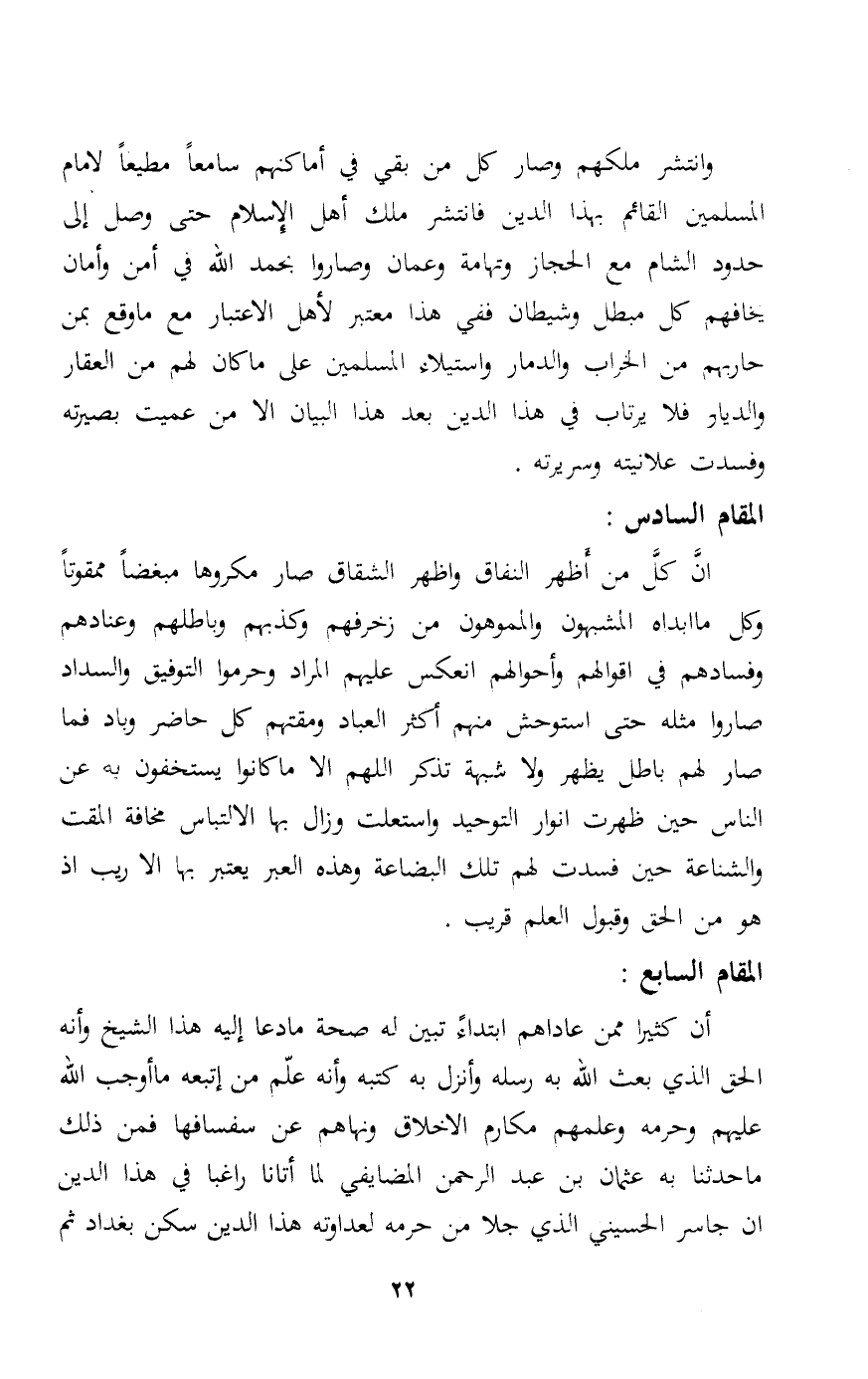 وانتشر ملكهم وصار كل من بقي في أماكنهم سامعا مطيعا لإمام المسلمين القائم بهذا الدين فانتشر ملك أهل الإسلام حتى وصل إلى حدود الشام مع حجاز وتهامة وعمان وصاروا بحمد الله في أمن وأمان يخافهم كل مبطل وشيطان ففي هذا معتبر لأهل الاعتبار بمن حاربهم من الخراب والدمار واستيلاء المسلمين على ماكان لهم من العقار والديار فلا يرتاب في هذا الدين بعد هذا البيان إلا من عميت بصيرته وفسدت علانيته وسريرته.