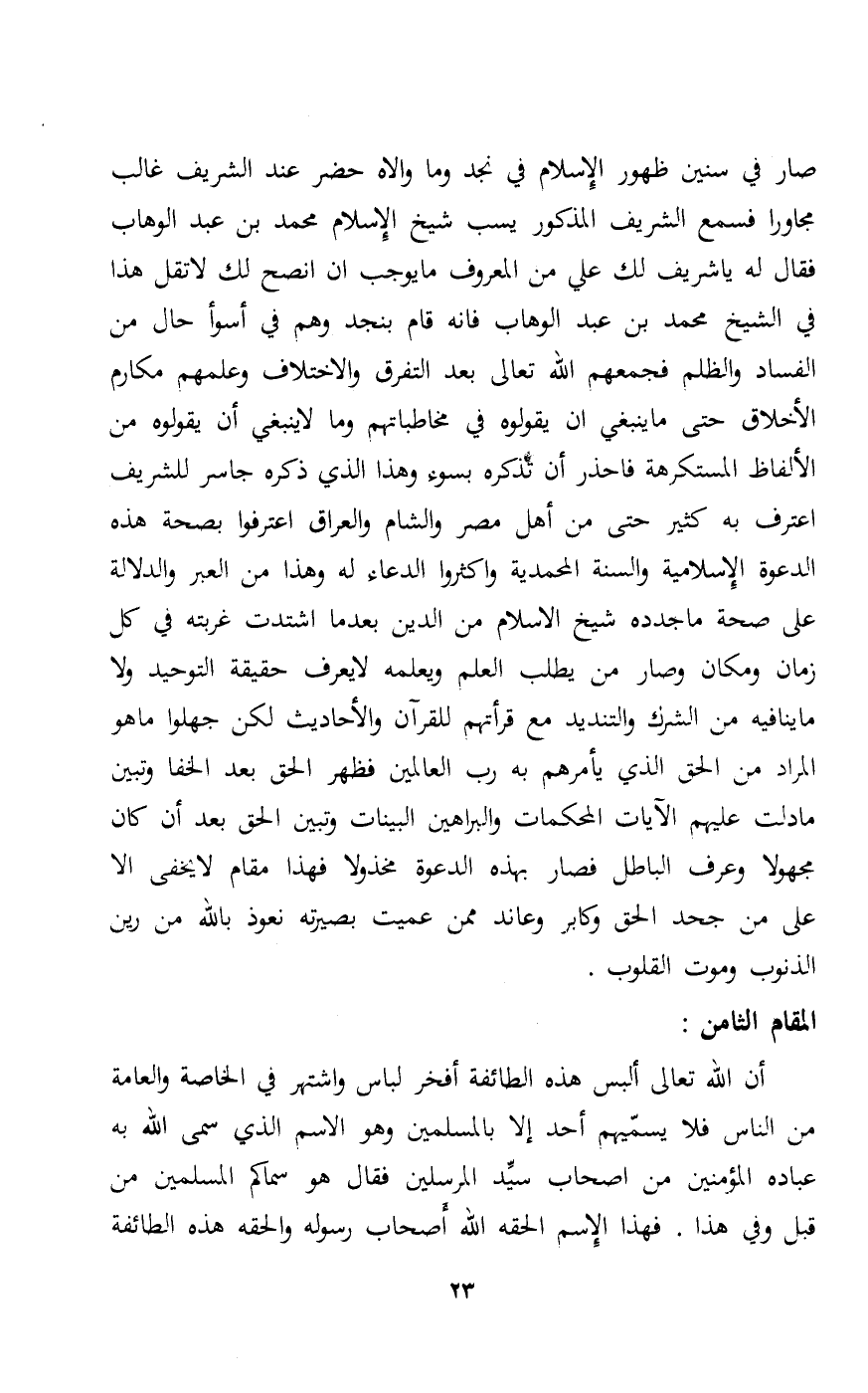 صار في سنين ظهور الإسلام في نجد وما والاه حضر عند الشريف غالب مجاورا فسمع الشريف المذكور يسب شيخ الإسلام محمد بن عبد الوهاب فقال له ياشريف لك من المعروف ما يوجب أن أنصح لك لا تقل هذا في الشيخ محمد بن عبد الوهاب فإنه قام بنجد وهم في أسوأ حال من الفساد والظلم فجمعهم الله تعالى بعد التفرق والاختلاف وعلمهم مكارم الأخلاق حتى ما ينبقي أن يقولوه في مخاطبتهم وما لا ينبقي أن يقولوه من الألفاظ المستكرهة فاحذر أن تذكره بسوء وهذا الذي ذكره جاسر للشريف اعترف يه كثير حتى من أهل مصر والشام والعراق اعترفوا بصحة هذه الدعوة الإسلامية والسنة المحمدية وأكثروا الدعاء له وهذا من العبر والدلالة على صحة ما جدده شيخ الإسلام من الدين بعدما اشتدت غربته في كل زمان ومكان وصار من يطلب العلم ويعلمه لا يعرف حقيقة التوحيد ولا ما ينافيه من الشرك والتنديد مع قراءتهم للقرآن والأحاديث لكن جهلوا ما هو المراد من الحق الذي يأمرهم به رب العالمين فظهر الحق بعد الخفا وتبين ما دلت عليهم الآيات المحكمات والبراهين البينات وتبين الحق بعد أن كان مجهولا وعرف الباطل فصار بهذه الدعوة مخذولا فهذا مقام لا يخفى إلا على من جحد الحق وكابر وعاند ممن عميت بصيرته نعوذ بالله من رين الذنوب وموت القلوب.
