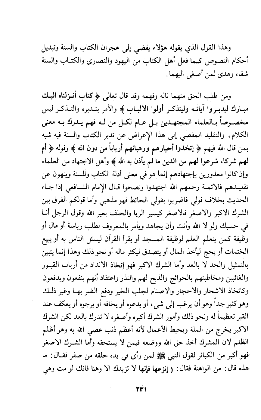 ومن طلب الحق منهما ناله وفهمه وقد قال تعالى: {كِتَابٌ أَنزَلْنَاهُ إِلَيْكَ مُبَارَكٌ لِيَدَّبَّرُوا آيَاتِهِ وَلِيَتَذَكَّرَ أُوْلُوا الأَلْبَابِ} والأمر بتدبره والتذكر ليس مخصوصا بالعلماء المجتهدين بل عام لكل من له فهم يدرك به معنى الكلام والتقليد المفضي إلى هذا الإعراض عن تدبر الكتاب والسنة فيه شبه بمن قال اله فيهم {اتَّخَذُوا أَحْبَارَهُمْ وَرُهْبَانَهُمْ أَرْبَابًا مِنْ دُونِ اللَّه} ِ وقوله: {أَمْ لَهُمْ شُرَكَاءُ شَرَعُوا لَهُمْ مِنَ الدِّينِ مَا لَمْ يَأْذَنْ بِهِ اللَّهُ} وأهل الاجتهاد من العلماء وإن كانوا معذورين بإجتهادهم إنما هو في معنى أدلة الكتاب والسنة وينهون عن تقليدهم فالأئمة رحمهم الله اجتهدوا ونصحوا قال الإمام الشافعي إذا جاء الحديث بخلاف قولي فاضربوا بقولي الحائط فهو مذهبي وأما قولكم الفرق بين الشرك الأكبر والأصغر كيسير الرياء والحلف بغير الله وقول الرجل أنا في حسبك ولولا الله وأنت وأن يجاهد بالمعروف لطلب رياسة أو مال أو وظيفة كمن يتعلم العلم لوظيفة المسجد أو يقرأ القرآن ليسئل الناس به أو يبيع الختمات أو يحج ليأخذ المال أو يتصدق ليكثر ماله أو نحو ذلك وهذا إنما يتبين بالتمثيل والحد لا بالعد وأما الشرك الأكبر فهو إتخاذ الأنداد من أرباب القبور والغائبين ومخاطبتهم بالحوائج والذبح لهم والنذر واعتقاد أنهم ينفعون ويدفعون وكاتخاذ الأشجار والأحجار والأصنام لجلب الخير ودفع الضر بها وغير ذلك وهو كثير جدا وهو أن يرغب إلى شيء أو يدعوه أو يخافه أو يرجوه أو يعكف عند القبر تعظيما له ونحو ذلك وأمور الشرك أكبره وأصغره لا تدرك بالعد لكن الشرك الأكبر يخرج من الملة ويحبط الأعمال لأنه أعظم ذنب عصي الله به وهو أظلم الظلم لأن المشرك أخذ حق الله ووضعه فيمن لا يستحقه وأما الشرك الأصغر فهو أكبر من الكبائر لقول النبي صلى الله عليه وسلم لمن رأى في يده حلقة من صفر فقال: ما هذه قال: من الواهنة فقال: "إنزعها فإنها لا تزيدك إلا وهنا فإنك لو مت وهي