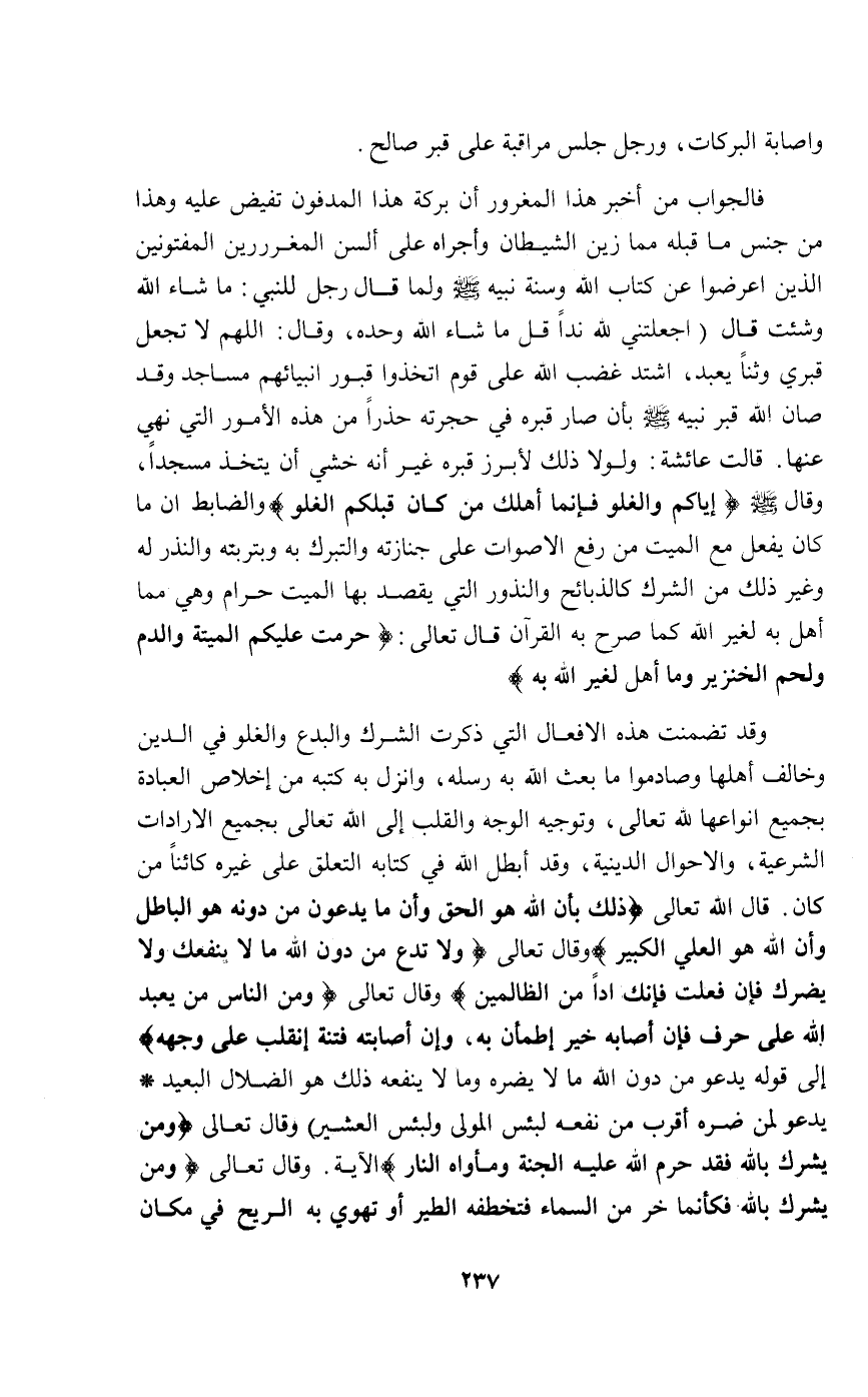 وقد تضمنت هذه الأفعال التي ذكرت الشرك والبدع والغلو في الدين وخالف أهلها وصادموا ما بعث الله به رسله وأنزل به كتبه من إخلاص العبادة بجميع أنواعها لله تعالى وتوجيه الوجه والقلب إلى الله تعالى بجميع الإرادات الشرعية والأحوال الدينية وقد أبطل الله في كتابه التعلق على غيره كائنا من كان قال الله تعالى: {ذَلِكَ بِأَنَّ اللَّهَ هُوَ الْحَقُّ وَأَنَّ مَا يَدْعُونَ مِنْ دُونِهِ هُوَ الْبَاطِلُ وَأَنَّ اللَّهَ هُوَ الْعَلِيُّ الْكَبِيرُ} وقال تعالى: {وَلاَ تَدْعُ مِنْ دُونِ اللَّهِ مَا لاَ يَنْفَعُكَ وَلاَ يَضُرُّكَ فَإِنْ فَعَلْتَ فَإِنَّكَ إِذًا مِنْ الظَّالِمِينَ} وقال تعالى: {وَمِنْ النَّاسِ مَنْ يَعْبُدُ اللَّهَ عَلَى حَرْفٍ فَإِنْ أَصَابَهُ خَيْرٌ اطْمَأَنَّ بِهِ وَإِنْ أَصَابَتْهُ فِتْنَةٌ انقَلَبَ عَلَى وَجْهِهِ} إلى قوله: {يَدْعُوا مِنْ دُونِ اللَّهِ مَا لاَ يَضُرُّهُ وَمَا لاَ يَنْفَعُهُ ذَلِكَ هُوَ الضَّلاَلُ الْبَعِيدُ*يَدْعُوا لَمَنْ ضَرُّهُ أَقْرَبُ مِنْ نَفْعِهِ لَبِئْسَ الْمَوْلَى وَلَبِئْسَ الْعَشِيرُ} وقال تعالى: {إِنَّهُ مَنْ يُشْرِكْ بِاللَّهِ فَقَدْ حَرَّمَ اللَّهُ عَلَيْهِ الْجَنَّةَ وَمَأْوَاهُ النَّارُ} الآية. وقال تعالى: {وَمَنْ يُشْرِكْ بِاللَّهِ فَكَأَنَّمَا خَرَّ مِنْ السَّمَاءِ فَتَخْطَفُهُ الطَّيْرُ أَوْ تَهْوِي بِهِ الرِّيحُ فِي مَكَانٍ