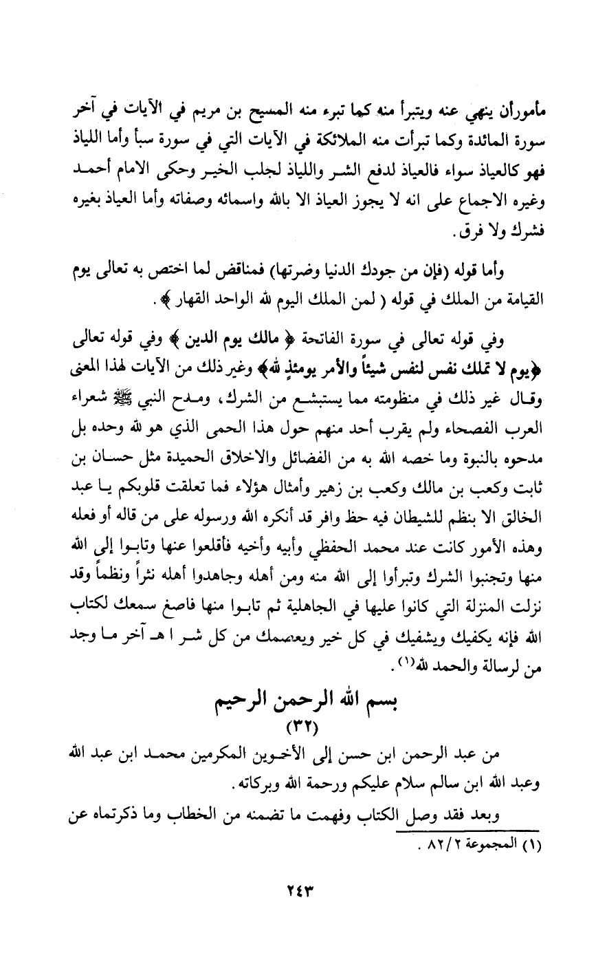 وفي قوله تعالى في سورة الفاتحة {مَالِكِ يَوْمِ الدِّينِ} وفي قوله تعالى {يَوْمَ لاَ تَمْلِكُ نَفْسٌ لِنَفْسٍ شَيْئًا وَالأَمْرُ يَوْمَئِذٍ لِلَّهِ} وغير ذلك من الآيات لهذا المعنى وقال غير ذلك في منظومته مما يستشبع من الشرك ومدح النبي صلى الله عليه وسلم شعراء العرب الفصحاء ولم يقرب أحد منهم حول هذا الحمى الذي هو لله وحده بل مدحوه بالنبوة وما خصه الله به من الفضائل والأخلاق الحميدة مثل حسان بن ثابت وكعب بن مالك وكعب بن زهير وأمثال هؤلاء فما تعلقت قلوبكم يا عبد الخالق إلا بنظم للشيطان فيه حظ وافر قد أنكره الله ورسوله على من قاله أو فعله وهذه الأمور كانت عند محمد الحفظي وأبيه وأخيه فأقلعوا عنها وتابوا إلى الله منها وتجنبوا الشرك وتبرؤا إلى الله منه ومن أهله وجاهدوا أهله نثرا ونظما وقد نزلت المنزلة التي كانوا عليها في الجاهلية ثم تابوا منها فاصغ سمعك لكتاب الله فإنه يكفيك ويشفيك في كل خير ويعصمك من كل شر اهـ آخر ما وجد من الرسالة والحمد لله1