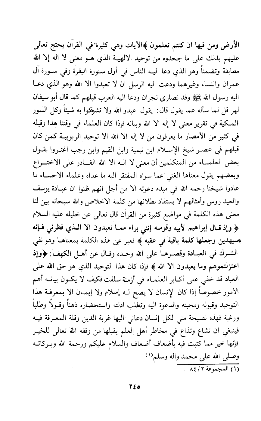 الأَرْضُ وَمَنْ فِيهَا إِنْ كُنتُمْ تَعْلَمُونَ} الآيات وهي كثيرة في القرآن يحتج تعالى عليهم بذلك على ما جحدوه من توحيد الألوهية الذي هو معنى لا إله إلا الله مطابقة وتضمنا وهو الذي دعا إليه الناس في أول سورة البقرة وفي سورة آل عمران والنساء وغيرهما ودعت إليه الرسل أن لا تعبدوا إلا الله وهو الذي دعا إليه رسول الله صلى الله عليه وسلم وفد نصارى نجران ودعا إليه العرب قبلهم كما قال أبو سفيان لهر قل لما سأله عما يقول قال: يقول اعبدوا الله ولا تشركوا به شيئا وكل السور المكية في تقرير معنى لا إله إلا الله وبيانه فإذا كان العلماء في وقتنا هذا وقبله في كثير من الأمصار ما يعرفون من لا إله إلا الله القادر على الاختراع وبعضهم يقول معناها الغني عما سواه المفتقر إليه ما عداه وعلماء الاحساء ما عادوا شيخنا رحمه الله: في مبدء دعوته إلا من أجل أنهم ظنوا أن عبادة يوسف والعيدروس وأمثالهم لا يستفاد بطلانها من كلمة الإخلاص والله سبحانه بين لنا معنى هذه الكلمة في مواضع كثيرة من القرآن قال تعالى: عن خليله عليه السلام {وَإِذْ قَالَ إِبْرَاهِيمُ ِلأَبِيهِ وَقَوْمِهِ إِنَّنِي بَرَاءٌ مِمَّا تَعْبُدُونَ*إِلاَّ الَّذِي فَطَرَنِي فَإِنَّهُ سَيَهْدِينِ*وَجَعَلَهَا كَلِمَةً بَاقِيَةً فِي عَقِبِهِ} فعبر عن هذه الكلمة بمعناها وهو نفي الشرك في العبادة وقصرها على الله وحده وقال عن أهل الكهف {وَإِذْ اعْتَزَلْتُمُوهُمْ وَمَا يَعْبُدُونَ إِلاَّ اللَّهَ} فإذا كان هذا التوحيد الذي هو حق الله على العباد قد خفي على أكابر العلماء في أزمنة سلفت فكيف لا يكون بيانه أهم الأمور خصوصا إذا كان الإنسان لا يصح له إسلام ولا إيمان الا بمعرفة هذا التوحيد وقبوله ومحبته والدعوة إليه وتطلب أدلته واستحضاره ذهنا وقولا وطلبا ورغبة فهذه نصيحة مني لكل إنسان دعاني إليها غربة الدين وقلة المعرفة فيه فينبغي أن تشاع وتذاع في مخاطر أهل العلم يقبلها من وفقه الله تعالى للخير فإنها خير مما كتبت فيه بأضعاف أضعاف والسلام عليكم ورحمة الله وبركاته وصلى الله على محمد وأله وسلم1