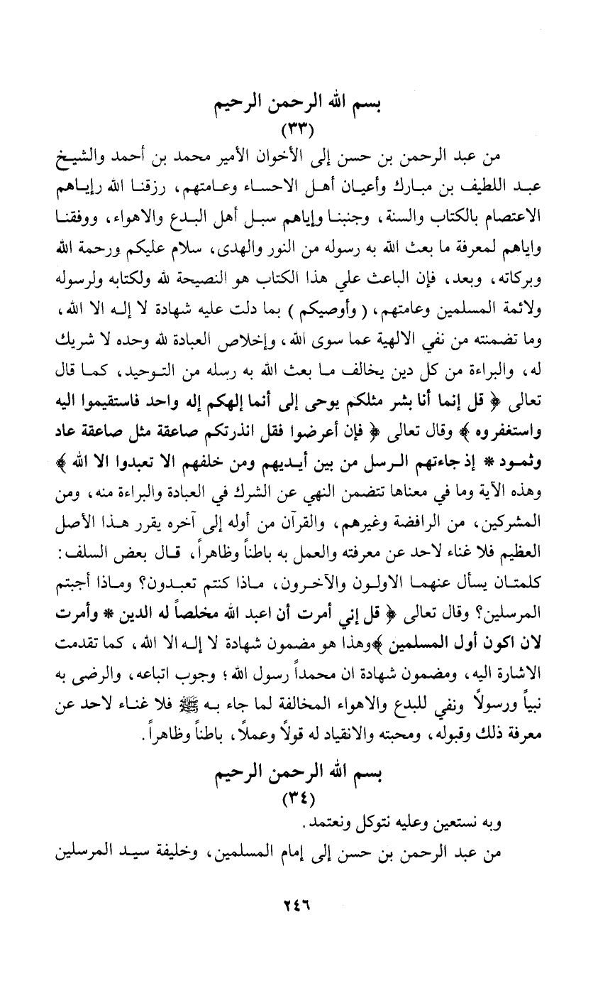 من عبد الرحمن بن حسن إلى الإخوان الأمير محمد بن أحمد والشيخ عبد اللطيف بن مبارك وأعيان أهل الإحساء وعامتهم رزقنا الله وإياهم الاعتصام بالكتاب والسنة وجنبنا وإياهم سبل أهل البدع والأهواء ووفقنا وإياهم لمعرفة ما بعث الله به رسوله من النور والهدى سلام عليكم ورحمة الله وبركاته وبعد فإن الباعث على هذا الكتاب هو النصيحة لله ولكتابه ولرسله ولأئمة المسلمين وعامتهم "وأوصيكم" بما دلت عليه شهادة لا إله إلا الله وما تضمنته من نفي الإلهية عما سوى الله وإخلاص العبادة لله وحده لا شريك له والبراءة من كل دين يخالف ما بعث الله به رسله من التوحيد كما قال تعالى: {قُلْ إِنَّمَا أَنَا بَشَرٌ مِثْلُكُمْ يُوحَى إِلَيَّ أَنَّمَا إِلَهُكُمْ إِلَهٌ وَاحِدٌ فَاسْتَقِيمُوا إِلَيْهِ وَاسْتَغْفِرُوهُ} وقال تعالى: {فَإِنْ أَعْرَضُوا فَقُلْ أَنذَرْتُكُمْ صَاعِقَةً مِثْلَ صَاعِقَةِ عَادٍ وَثَمُودَ*إِذْ جَاءَتْهُمُ الرُّسُلُ مِنْ بَيْنِ أَيْدِيهِمْ وَمِنْ خَلْفِهِمْ أَلاَّ تَعْبُدُوا إِلاَّ اللَّه} َ وهذه الآية وما في معناها تتضمن النهي عن الشرك في العبادة والبراءة منه ومن المشركين من الرافضة وغيرهم والقرآن من أوله إلى آخره يقرر هذه الأصل العظيم فلا غناء لأحد عن معرفته والعمل به باطنا وظاهرا قال بعض السلف: كلمتان يسأل عنهما الألون والآخرون ماذا كنتم تعبدون؟ وماذا أجبتم المرسلين؟ وقال تعالى: {قُلْ إِنِّي أُمِرْتُ أَنْ أَعْبُدَ اللَّهَ مُخْلِصًا لَهُ الدِّينَ*وَأُمِرْتُ ِلأَنْ أَكُونَ أَوَّلَ الْمُسْلِمِينَ} وهذا هو مضمون شهادة أن محمد رسول الله وجوب إتباعه والرضى به نبيا ورسولا ونفي للبدع والأهواء المخالفة لما جاء به صلى الله عليه وسلم فلا غناء لأحد عن معرفة ذلك وقبوله ومحبته والإنقياد له قولا وعملا باطنا وظاهرا.