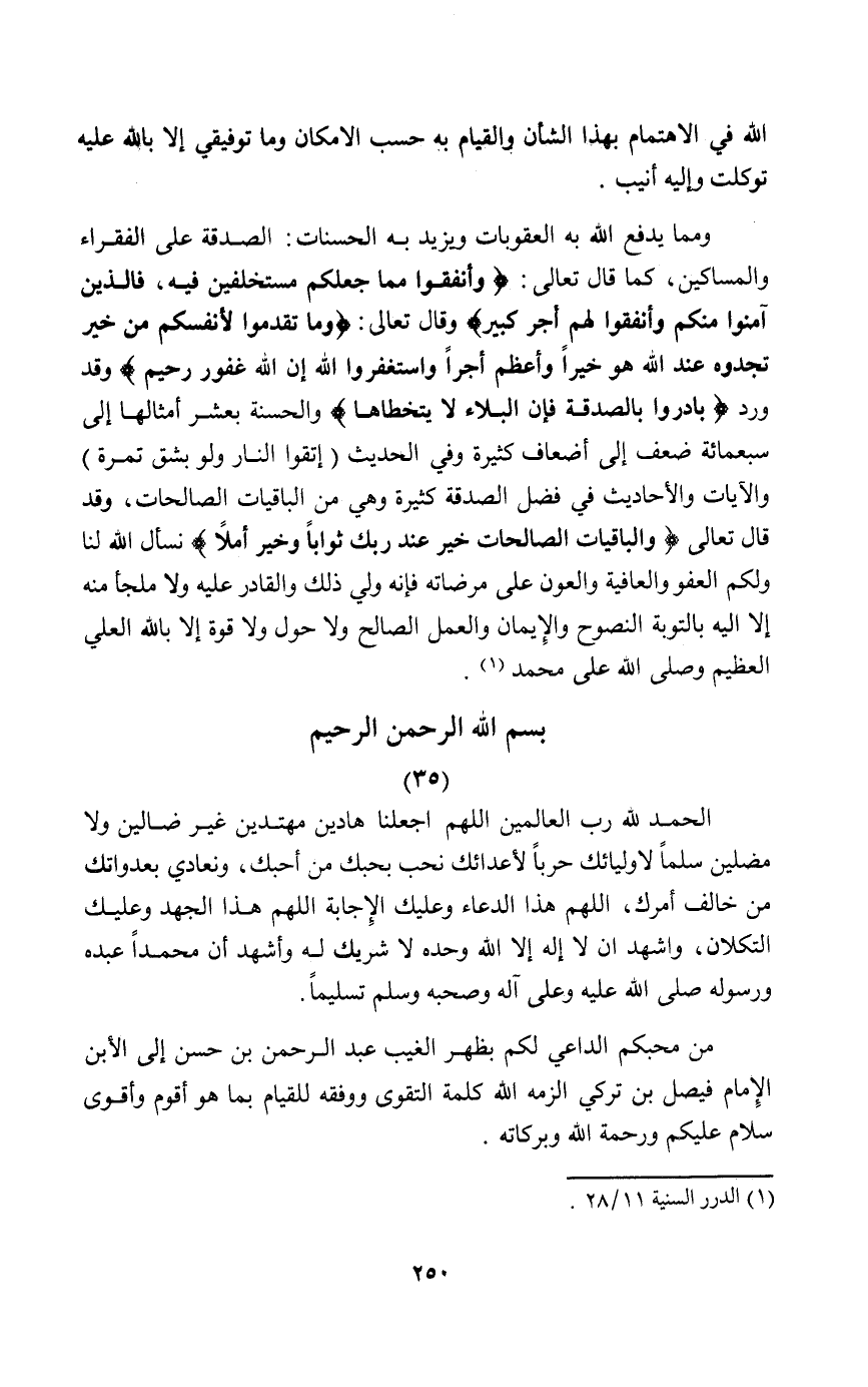 من محبكم الداعي لكم بظهر الغيب عبد الرحمن بن حسن إلى الأبن الإمام فيصل بن تركي الزمه الله كلمة التقوى ووفقه للقيام بما هو أقوم وأقوى سلام عليكم ورحمة الله وبركاته.