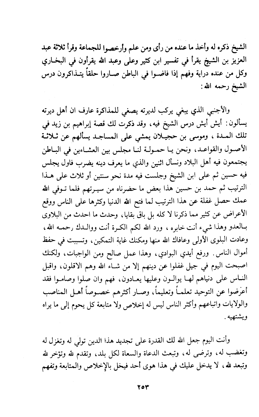 الشيخ ذكره له وأخذ ما عنده من رأي ومن علم وأرخصوا للجماعة وقرأ ثلاثة عبد العزيز بن الشيخ يقرأ في تفسير ابن كثير وعلي وعبد الله يقرأون في البخاري وكل من عنده دراية وفهم إذا فاضوا في الباطن صاروا حلقا يتذاكرون درس الشيخ رحمه الله: