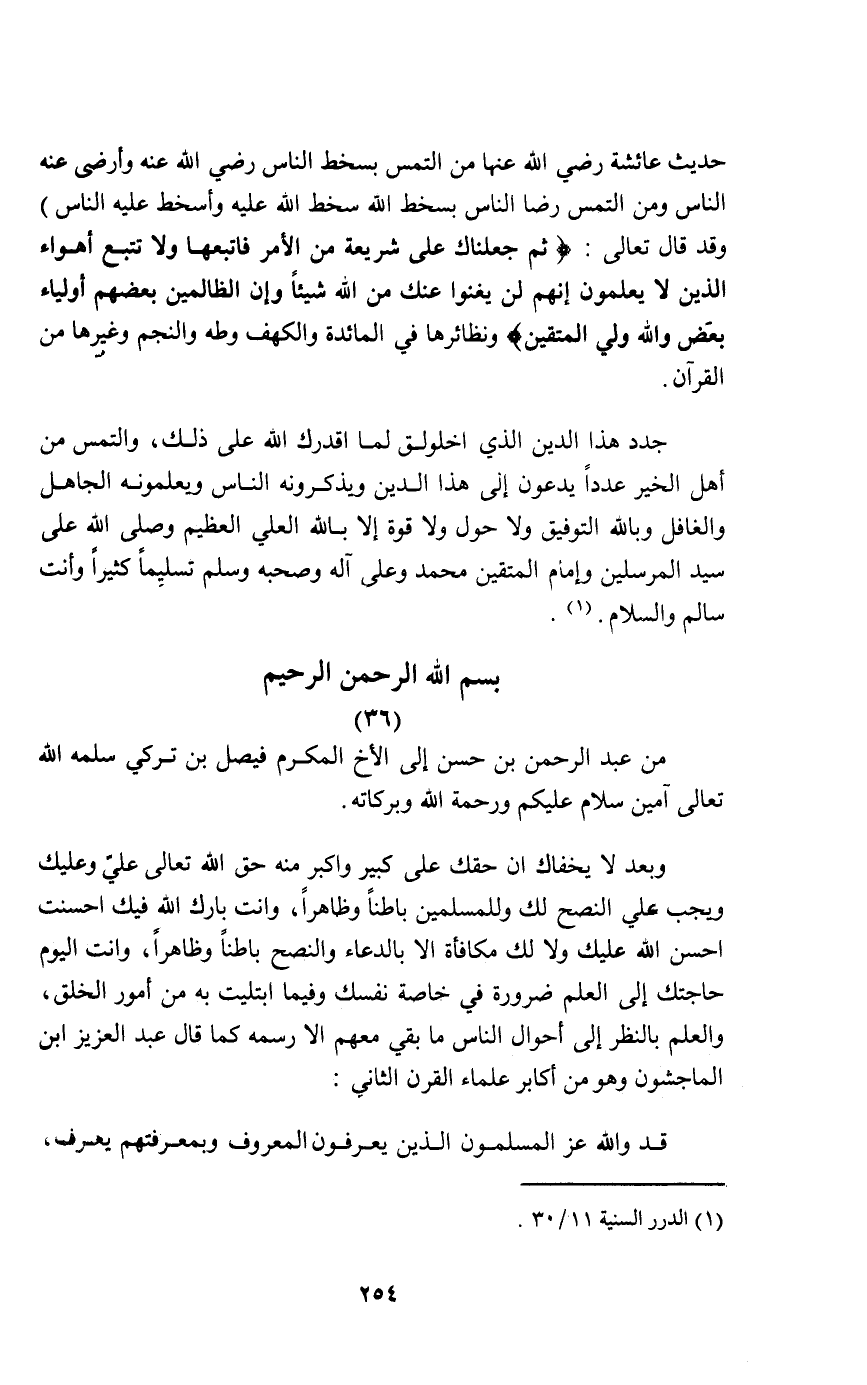 من عبد الرحمن بن حسن إلى الأخ المكرم فيصل بن تركي سلمه الله تعالى آمين سلام عليكم ورحمة الله وبركاته.