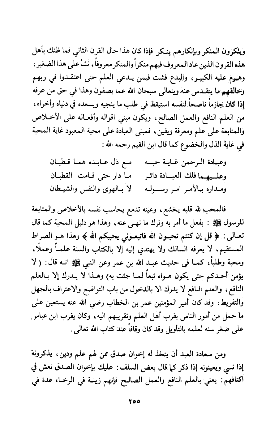 وينكرون المنكر وبإنكارهم ينكر فإذا كان هذا حال القرن الثاني فما ظنك بأهل هذه القرون الذين عاد المعروف فيهم منكرا والمنكر معروفا نشأ هذا الضغير وهرم عليه الكبير والبدع فشت فيمن يدعي العلم حتى اعتقدوا في ربهم وخالقهم ما يتقدس عنه ويتعالى سبحان الله عما يصفون وهذا في حق من عرفه إذا كان جازما ناصحا لنفسه استيقظ في طلب ما ينجيه ويسعده في دنياه وأخراه من العلم النافع والعمل الصالح ويكون مبني أقواله وأفعاله على الإخلاص والمتابعة على علم ومعرفة ويقين فمبنى العبادة على محبة المعبود غاية المحبة في غاية الذل والخضوع كما قال ابن القيم رحمه الله: