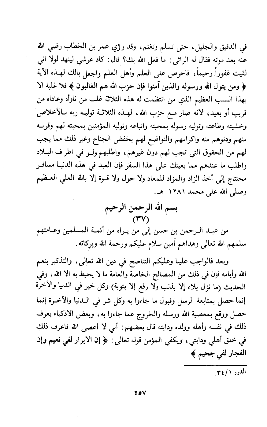 من عبد الرحمن بن الحسن إلى من يراه من أئمة المسلمين وعامتهم سلمهم الله تعالى وهداهم آمين سلام عليكم ورحمة الله وبركاته.