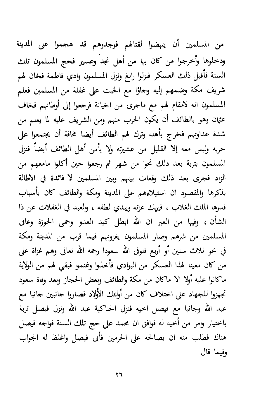 من المسلمين أن ينهضوا أن ينهضوا لقتالهم فوجدوهم قد هجموا على المدينة ودخلوها وأخرجوا من كان بها من أهل نجد وعسير فحج المسلمون تلك السنة فأقبل ذلك العسكر فنزلوا رابغ ونزل المسلمون وادي فاطمة فخان لهم شريف مكة وضمهم إليه وجاؤا مع الخبت على غفلة من المسلمين فعلم المسلمون أنه لا مقام لهم مع ما جرى من الخيانة فرجعوا إلى أوطانهم فخاف عثمان وهو بالطائف أن يكون الحرب منهم ومن الشريف عليه لما يعلم من شدة عداوتهم فخرج باهله وترك لهم الطائف أيضا مخافة أن يجتمعوا على حربه وليس معه إلا القليل من عشيرته ولا يأمن أهل الطائف أيضا فنزل المسلمون بتربة بعد ذلك نحوا من شهر ثم رجعوا حين أكلوا ما معهم من الزاد فجرى بعد ذلك نحوا من شهر ثم رجعوا حين أكلوا ما معهم من الزاد فجرى بعد ذلك وقعات بينهم وبين المسلمين لا فائدة في الإطالة بذكرها والمقصود أن إستيلاءهم على المدينة ومكة والطائف كان بأسباب قدرها الملك الغلاب فيريك عزته ويبدي لطفه والعبد في الغفلات عن ذا الشأن وفيها من العبر أن الله أبطل كيد العدو وحمى الحوزة وعافى المسلمين من شرهم وصار المسلمون يغزونهم فيما قرب من المدينة ومكة في نحو ثلاث سنين أو أربع فتوفى الله سعودا رحمه الله تعالى: وهم غزاة على من كان معينا لهذا العسكر من البوادي فأخذوا وغنموا فبقي لهم من الولاية ما كانوا عليه أولا إلا ما كان من مكة والطائف وبعض الحجاز وبعد وفاة سعود تجهزوا للجهاد على اختلاف كان من أولئك الأولاد فصاروا جانبين جانبا مع عبد الله وجانبا مع فيصل أخيه فنزل الحناكية عبد الله ونزل فيصل تربة باختيار وأمر من أخيه له فوافق أن محمد على حج تلك السنة فواجه فيصل هناك فطلب منه أن يصالحه على الحرمين فأبى فيصل وأغلظ له الجواب وفيما قال
