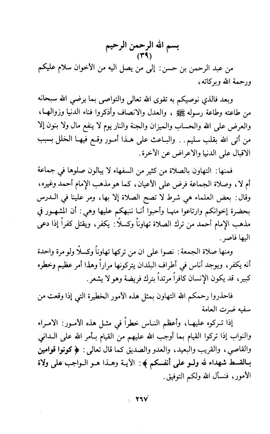 من عبد الرحمن بن حسن إلى من يصل إليه الإخوان سلام عليكم ورحمة الله وبركاته.