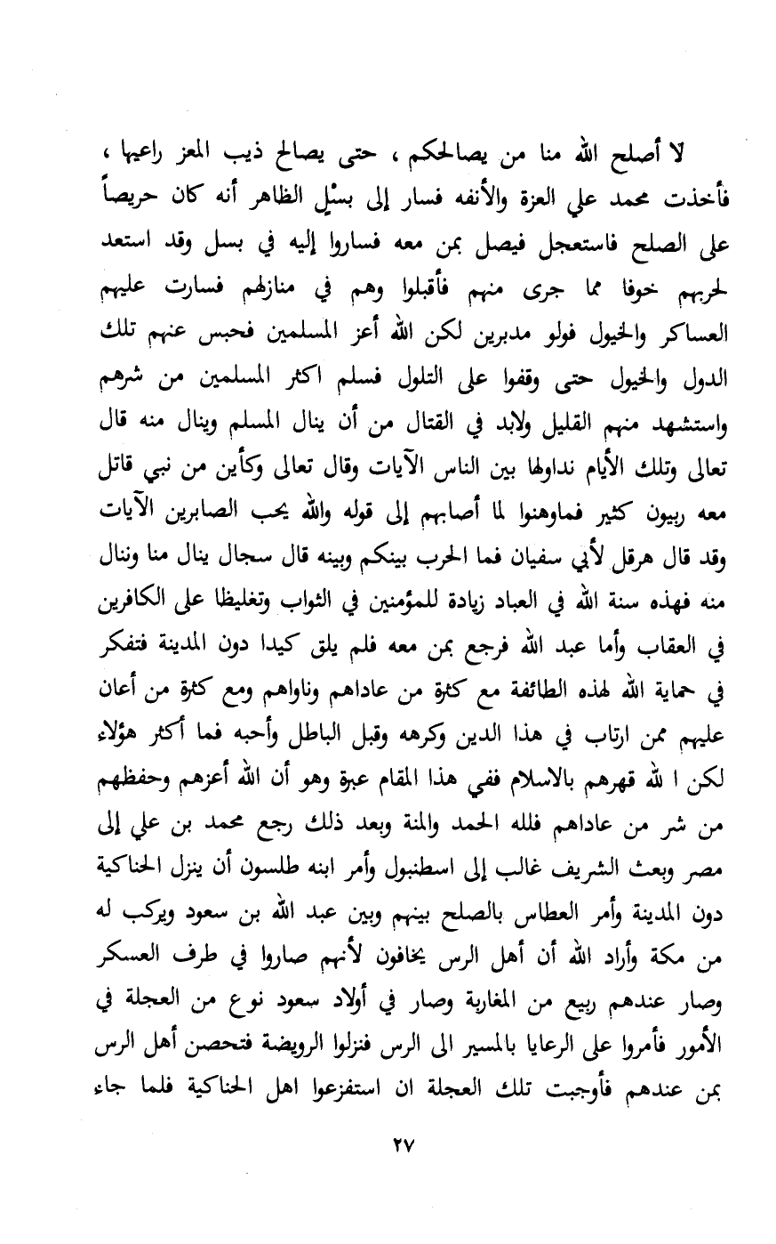 لا أصلح الله من يصالحكم حتى يصالح ذيب المعز راعيها فأخذت محمد علي العزة والأنفة فسار إلى بسل الظاهر أنه كان حريصا على الصلح فاستعجل فيصل بمن معه فساروا إليه في بسل وقد استعد لحربهم خوفا مما جرى منهم فأقبلوا وهم في منازلهم فسارت عليهم العساكر والخيول فولو مدبرين لكن الله أعز المسلمين فحبس عنهم تلك الدول والخيول حتى وقفوا على التلول فسلم أكثر المسلكين من شرهم واستشهد منهم القليل ولا بد في القتال من أن ينال المسلم وينال منه قال تعالى: وتلك الأيام نداولها بين الناس الآيات وقال تعالى: وكأين من نبي قاتل معه ربيون كثير فما وهنوا لما أصابهم إلى قوله: والله يحب الصابرين الآيات وقد قال هرقل لأبي سفيان فما الحرب بينكم وبينه قال سجال ينال منا وننال منه فهذه سنة الله في العباد زيادة للمؤمنين في الثواب وتغليظا على الكافرين في العقاب وأما عبد الله فرجع بمن معه فلم يلق كيدا دون المدينة فتفكر في حماية الله لهذه الطائفة مع كثرة من عاداهم وناواهم ومع كثرة من أعان عليهم ممن ارتاب في هذا الدين وكرهه وقبل الباطل وأحبه فما أكثر هؤلاء لكن الله قهرهم بالإسلام ففي هذا المقام عبرة وهو أن الله أعزهم وحفظهم من شر من عاداهم فلله الحمد والمنة وبعد ذلك رجع محمد بن علي إلى مصر وبعث الشريف غالب إلى اسطنبول وأمر ابنه طلسون أن ينزل الحناكية دون المدينة وأمر العطاس بالصلح بينهم وبين عبد الله بن سعود نوع من العجلة في الأمور فأمروا على الرعايا بالمسير إلى الرس فنزلوا الرويضة فتحصن أهل الرس بمن عندهم فأوجبت تلك العجلة أن يستفزعوا أهل الحناكية فلما جاء