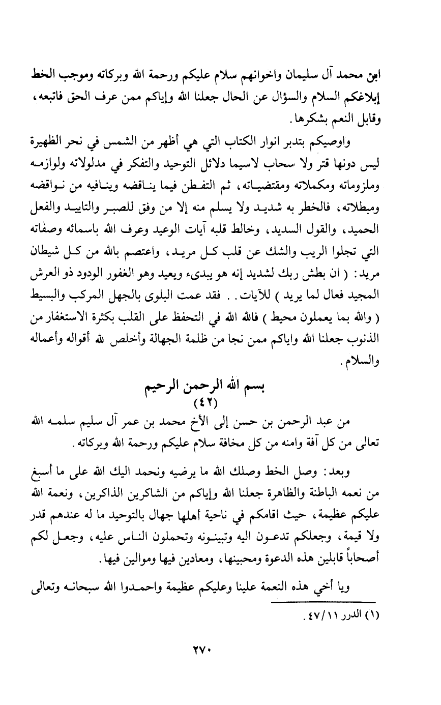 من عبد الرحمن بن حسن إلى الأخ محمد بن عمر آل سليم سلمه الله تعالى من كل آفة وأمنه من كل مخافة سلام عليكم ورحمة الله وبركاته.
