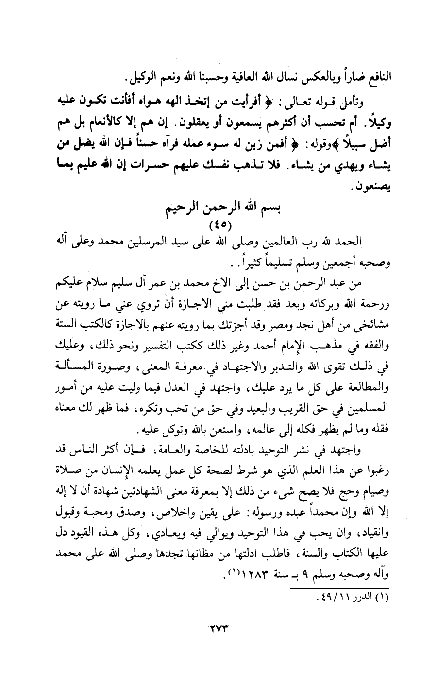 من عبد الرحمن بن حسن إلى الأخ محمد بن عمر آل سليم سلام عليكم ورحمة الله وبركاته وبعد فقد طلبت مني الإجازة أن تروي عني ما رويته عن مشائخى من أهل نجد ومصر وقد أجزتك بما رويته عنهم بالا جازة كالكتب الستة والفقه في مذهب الإمام أحمد وغير ذلك ككتب التفسير ونحو ذلك وعليك في ذلك تقوى الله والتدبر والاجتهاد في معرفة المعنى وصورة المسألة والمطالعة على كل ما يرد عليك واجتهد في العدل فيما وليت عليه من أمور المسلمين في حق القريب والبعيد وفي حق من تحب وتكره فما ظهر لك معناه فقله وما لم يظهر فكله إلى عالمه واستعن بالله وتوكل عليه.