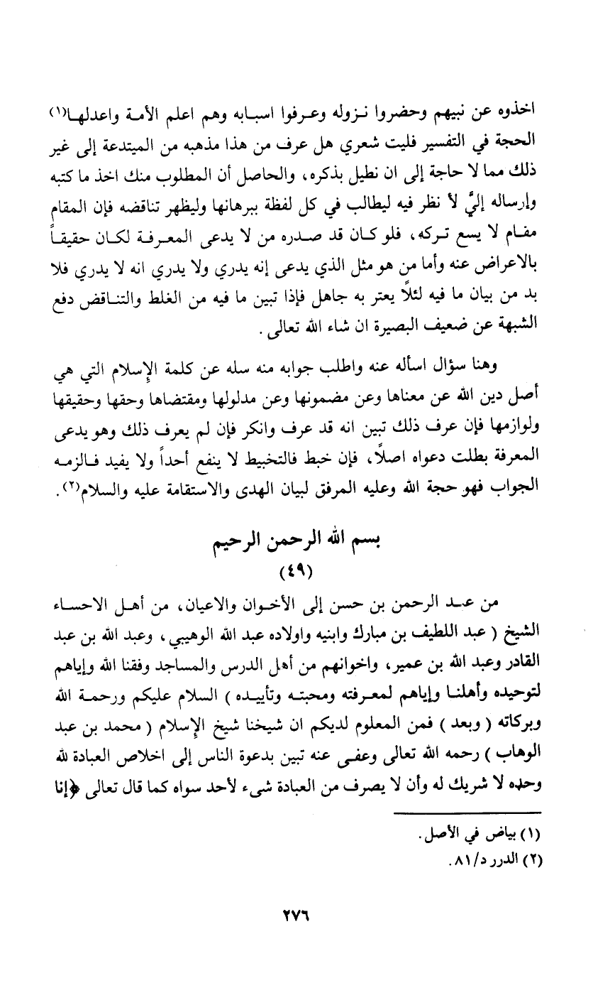 من عبد الرحمن بن حسن إلى الأخوان والأعيان من أهل إلا حساء الشيخ "عبد اللطيف بن مبارك وابنيه وأولاده عبد الله الوهيبي وعبد الله بن عبد القادر وعبد الله بن عمير وإخوانهم من أهل الدرس والمساجد وفقنا الله وإياهم لتوحيده وأهلنا وإياهم لمعرفته ومحبته وتأييده" السلام عليكم ورحمة الله وبركاته "وبعد" فمن المعلوم لديكم إن شيخنا شيخ الإسلام "محمد بن عبد الوهاب" رحمه الله تعالى: وعفى عنه تبين بدعوة الناس إلى خلاص العبادة لله وحده لا شريك له وأن لا يصرف شيء لأحد سواه كما قال تعالى: {إِنَّا