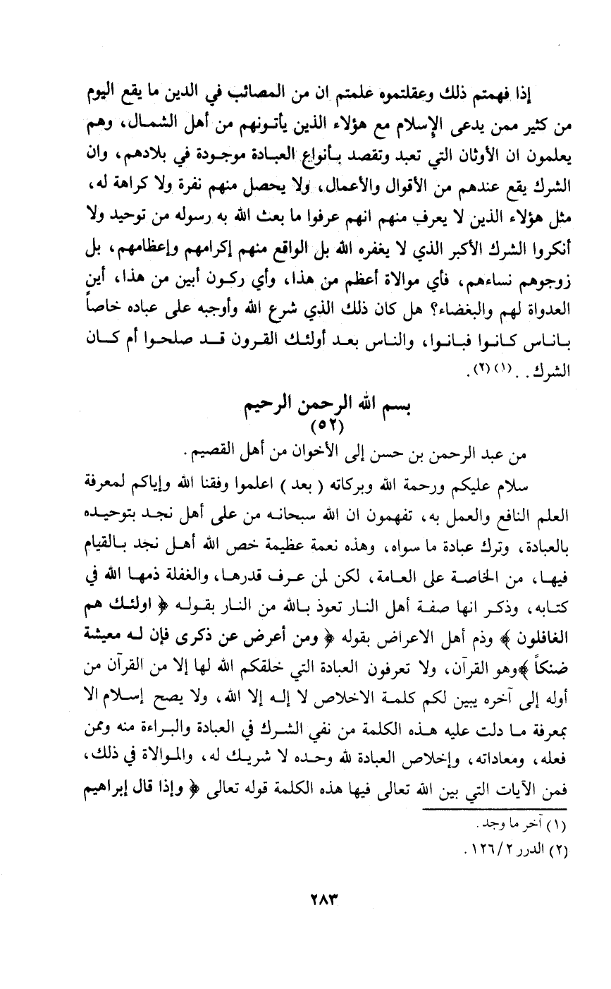 سلام عليكم ورحمة الله وبركاته "بعد" اعلموا وفقنا الله وإياكم لمعرفة العلم النافع والعمل به تفهمون أن الله سبحانه من على أهل نجد بتوحيده بالعبادة وترك عبادة ما سواه وهذه نعمة عظيمة خص الله أهل نجد بالقيام فيها من الخاصة على العامة لكن لمن عرف قدرها والغفلة ذمها الله في كتابه وذكر أنها صفة أهل النار تعوذ بالله من النار بقوله: {أُوْلَئِكَ هُمُ الْغَافِلُونَ} وذم أهل الإعراض بقوله: {وَمَنْ أَعْرَضَ عَنْ ذِكْرِي فَإِنَّ لَهُ مَعِيشَةً ضَنكًا} وهو القرآن ولا تعرفون العبادة التي خلقكم الله لها إلا من القرآن من أوله إلى آخره يبين لكم كلمة الإخلاص لا إله إلا الله ولا يصح إسلام إلا بمعرفة ما دلت عليه هذه الكلمة من نفي الشرك في العبادة والبراءة منه وممن فعله ومعاداته وإخلاص العبادة لله وحده لا شريك له والموالاة في ذلك فمن الآيات التي بين الله تعالى فيها هذه الكلمة قوله تعالى {وَإِذْ قَالَ إِبْرَاهِيمُ