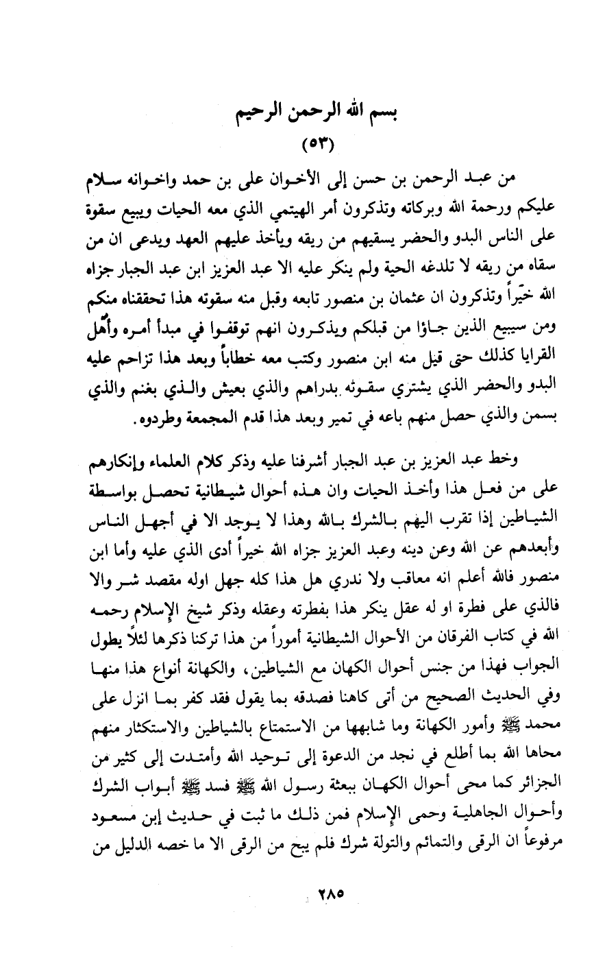 من عبد الرحمن بن حسن إلى الأخوان علي بن حمد وإخوانه سلام عليكم ورحمة الله وبركاته وتذكرون أمر الهيتمي الذي معه الحيات ويبيع سقوة على الناس البدو والحضر يسقيهم من ريقه ويأخذ عليهم العهد ويدعي أن من سقاه من ريقه لا تلدغه الحية ولم ينكر عليه إلا عبد العزيز بن عبد الجبار جزاه الله خيرا وتذكرون أن عثمان بن منصور وكتب تابعه وقبل منه سقوته هذا تحققناه منكم ومن سيبيع الذين جاؤا من قبلكم ويذكرون إنهم توقفوا في مبدأ أمره وأهل القرايا كذلك حتى قيل منه ابن منصور وكتب معه خطابا وبعد هذا تزاحم عليه البدو والحضر الذي يشتري سقوته بدراهم والذي بعيش والذي بغنم والذي بسمن والذي حصل منهم باعه في تمير وبعد هذا قدم المجمعة وطردوه.