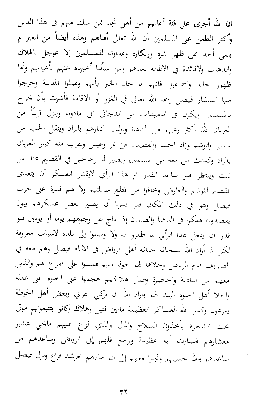 أن الله أجرى على فئة أعانهم من أهل نجد ممن شك منهم في هذا الدين وأكثر الطعن على المسلمين أن الله تعالى أفناهم وهذه أيضا من العبر لم يبق أحد ممن ظهر شره وإنكاره وعداوته للمسلمين إلا عوجل بالهلاك والذهاب ولا فائدة في الإطالة بعدهم ومن سألنا أخبرناه عنهم بأعيانهم وأما ظهور خالد وإسماعيل فإنهم لما جاء الخبر بأنهم وصلوا المدينة وخرجوا منها استشار فيصل رحمه الله تعالى: في الغزو أو الإقامة فأشرت بأن يخرج بالمسلمين ويكون البطينيات من الدجاني إلى ما دونه وينزل قريبا من العربان لأن أكثر رعيهم من الدهنا ويؤلف كبارهم بالزاد وينقل الحب من سدير والوشم وزاد الحسا والقطيف من تمر وعيش ويقرب منه كبار العربان بالزاد وكذلك من معه من المسلمين ويصير له رجاجبل في القصيم عند من ثبت وينتظر فلو ساعد القدر تم الرأي لا يقدر العسكر أن يتعدى القصيم للوشم والعارض وخافوا من قطع سابلتهم ولا لهم قدرة على حرب فيصل وهو في ذلك المكان فلو قدرنا أن يصير بعض عسكرهم يبون يقصدونه هلكوا في الدهنا والصمنا إذا ماج عن وجوههم يوما أو يومين فلو قدر أن يفعل هذا الراي لما ظفروا به ولا وصلوا على بلده لأسباب معروفة لكن لما أراد الله سبحانه خيانة أهل الرياض في الإمام فيصل وهو معه في الصريف قدم الرياض وخلاها لهم خوفا منهم فمشوا على الفرع هم والذين معهم من البادية والحاضرة وصار هلاكهم هجموا على الحلوه على غفلة وإخلاء أهل الحلوة البلد لهم وأراد الله أن تركي الهزاني وبعض أهل الحوطة يفزعون وكسر الله العساكر العظيمة ما بين قتيل وهلاك وكانوا يتتبعونهم موتى تحت الشجرة يأخذون السلاح والمال والذي فزع عليهم ما يجي عشير معشارهم فصارت آية عظيمة ورجع فلهم إلى الرياض وساعدهم من ساعدهم والله حسيبهم وتجلوا معهم إلى أن جاءهم خرشد فزاع ونزل فيصل