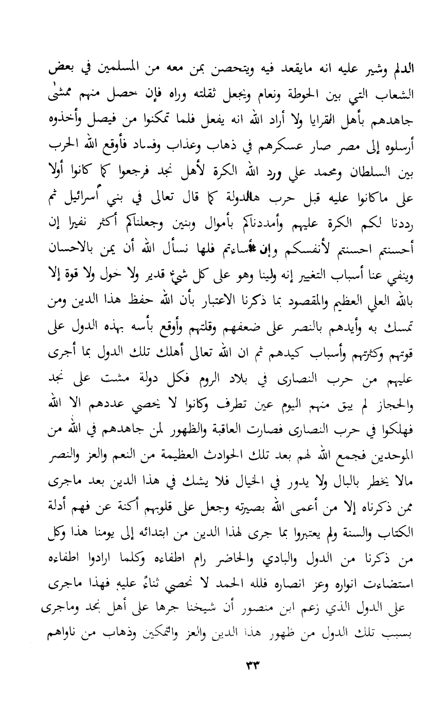الحرب بين السلطان ومحمد علي ورد الله الكرة لأهل نجد فرجعوا كما كانوا أولا على ما كانوا عليه قبل حربهغ لدولة كما قال تعالى: في بني إسرائيل {ثُمَّ رَدَدْنَا لَكُمُ الْكَرَّةَ عَلَيْهِمْ وَأَمْدَدْنَاكُمْ بِأَمْوَالٍ وَبَنِينَ وَجَعَلْنَاكُمْ أَكْثَرَ نَفِيراً إِنْ أَحْسَنْتُمْ أَحْسَنْتُمْ لَأَنْفُسِكُمْ وَإِنْ أَسَأْتُمْ فَلَهَا} نسأل الله أن يمن بالاحسان وينفي عنا أسباب التغيير إنه ولينا وهو كل شيئ قديرول ولا حول ولا قوة إلا بالله العلي العظيم والمقصود بما ذكرنا الاعتبار بأن الله حفظ هذا الدين ومن تمسك به وأيدهم بالنصر على ضعفهم وقلتهم وأوقع بأسه بهذه الدول على قوتهم وكثرتهم وأسباب كيدهم ثم أن الله تعالى أهلك تلك الدول بما جرى عليهم من حرب النصارى في بلاد الروم فكل دولة مشت على نجد والحجاز لم يبق منهم اليوم عين تطرف وكانوا لا يحصي عددهم إلا بالله فهلكوا في حرب النصارى فصارت العاقبة والظهور لمن جاهدهم في الله من الموحدين فجمع الله لهم بعد تلك الحوادث العظيمة من النعم والعز والنصر ما لا يخطر بالبال ولا يدور في الخيال فلا يشك في هذا الدين بعد ما جرى مما ذكرناه إلا من أعمى الله بصيرته وجعل على قلوبهم أكنة عن فهم أدلة الكتاب والسنة ولم يعتبروا بما جرى لهذا الدين من ابتدائه إلى يومنا هذا وكل من ذكرنا من الدول والبادي والحاضر رام إطفائه وكلما أرادوا إطفائه استضاءت أنواره وعزه أنصاره فلله الحمد لا نحصي ثناء عليه فهذا ما جرى على الدول الذي زعم ابن منصور أن شيخنا جرها على أهل نجد وما جرى بسبب تلك الدول من ظهور هذا الدين والعز والتمكين وذهاب من ناوأهم