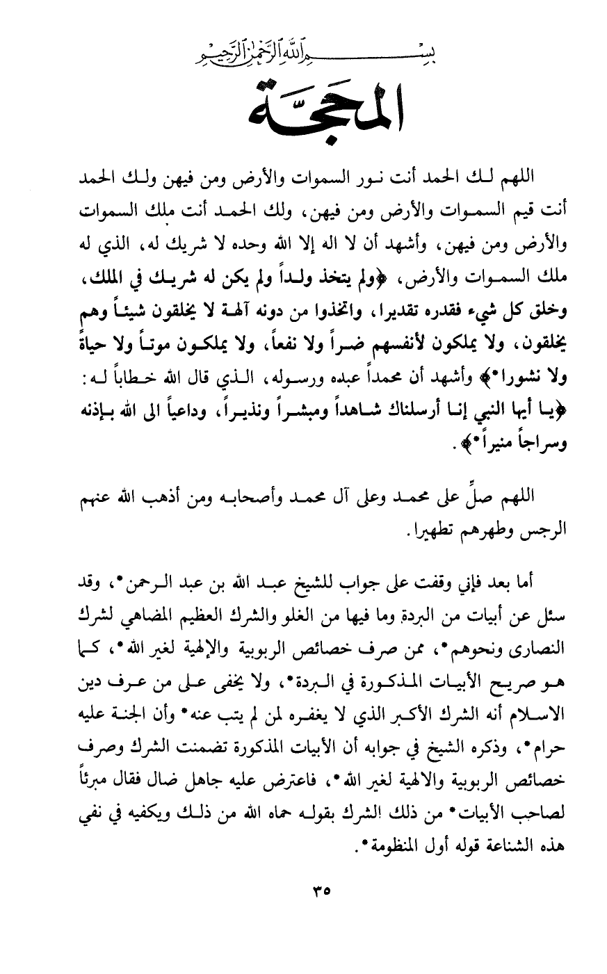 أما بعد فإني وقفت على جواب للشيخ عبد الله بن عبد الرحمن وقد سئل عن أبيات من البردة وما فيها من الغلو والشرك العظيم المضاهي لشرك النصارى ونحوهم, ممن صرف خصائص الربوبية والإلهية لغير الله كما هو صريح الأبيات المذكورة في البردة ولا يخفى على من عرف دين الإسلام أنه الشرك الأكبر الذي لا يغفره لمن يتب عنه وأن الجنة عليه حرام وذكره الشيخ في جوابه أن الأبيات المذكورة تضمنت الشرك وصرف خصائص الربوبية والإلهية لغير الله فاعترض عليه جاهل ضال فقال مبرئا لصاحب الأبيات من ذلك الشرك بقوله: حماه الله من ذلك ويكفيه في نفي هذه الشناعة قوله: أول المنظومة.