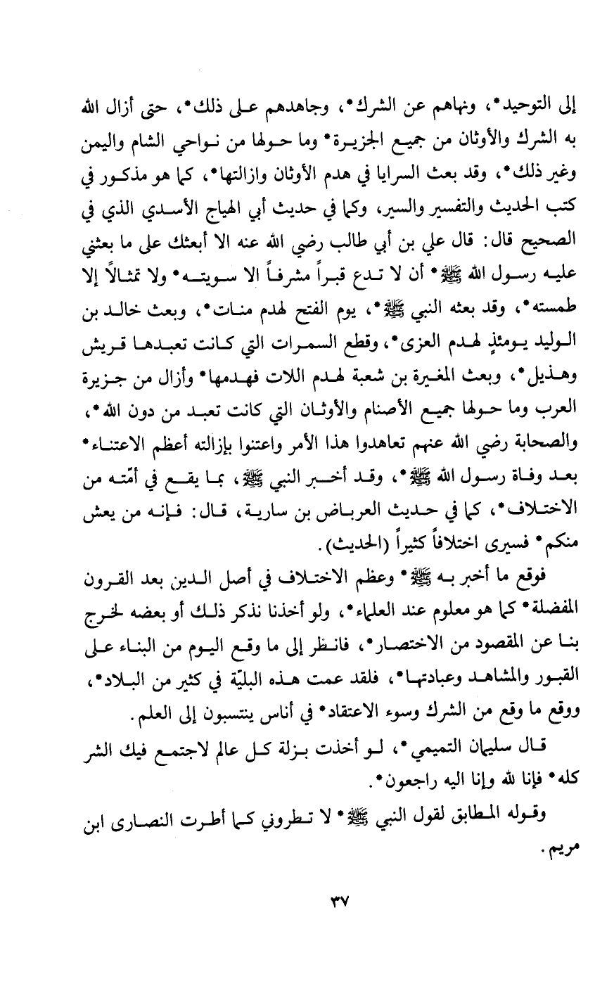 إلى التوحيد ونهاهم عن الشرك وجاهدهم على ذلك حتى أزال الله به الشرك والأوثان من جميع الجزيرة وما حولها من نواحي الشام واليمن وغير ذلك وقد بعث السرايا في هدم الأوثان وإزالتها كما هو مذكور في كتب الحديث والتفسير والسير وكما في حديث أبي الهياج الأسدي الذي في الصحيح قال: قال علي بن ابي طالب رضي الله عنه ألا أبعثك على ما بعثني عليه رسول الله صلى الله عليه وسلم "أن لا تدع قبرا مشرفا إلا سويته ولا تمثالا إلا طمسته" وقد بعثه النبي صلى الله عليه وسلم يوم الفتح لهدم منات وبعث خالد بن الوليد يومئذ لهدم العزى وقطع السمرات التي كانت تعبدها قريش وهذيل وبعث المغيرة بن شعبة لهدم اللات فهدمها وأزال من جزيرة العرب وما حولها جميع الأصنام والأوثان التي كانت تعبد من دون الله والصحابة رضي الله عنهم تعاهدوا هذا الأمر واعتنوا بإزالته أعظم الا عتناء بعد وفاة رسول الله صلى الله عليه وسلم وقد أخبر النبي صلى الله عليه وسلم بما يقع في أمته من الاختلاف كما في حديث العرباض بن سارية قال: "فإنه من يعش منكم فسيرى اختلافا كثيرا". الحديث.