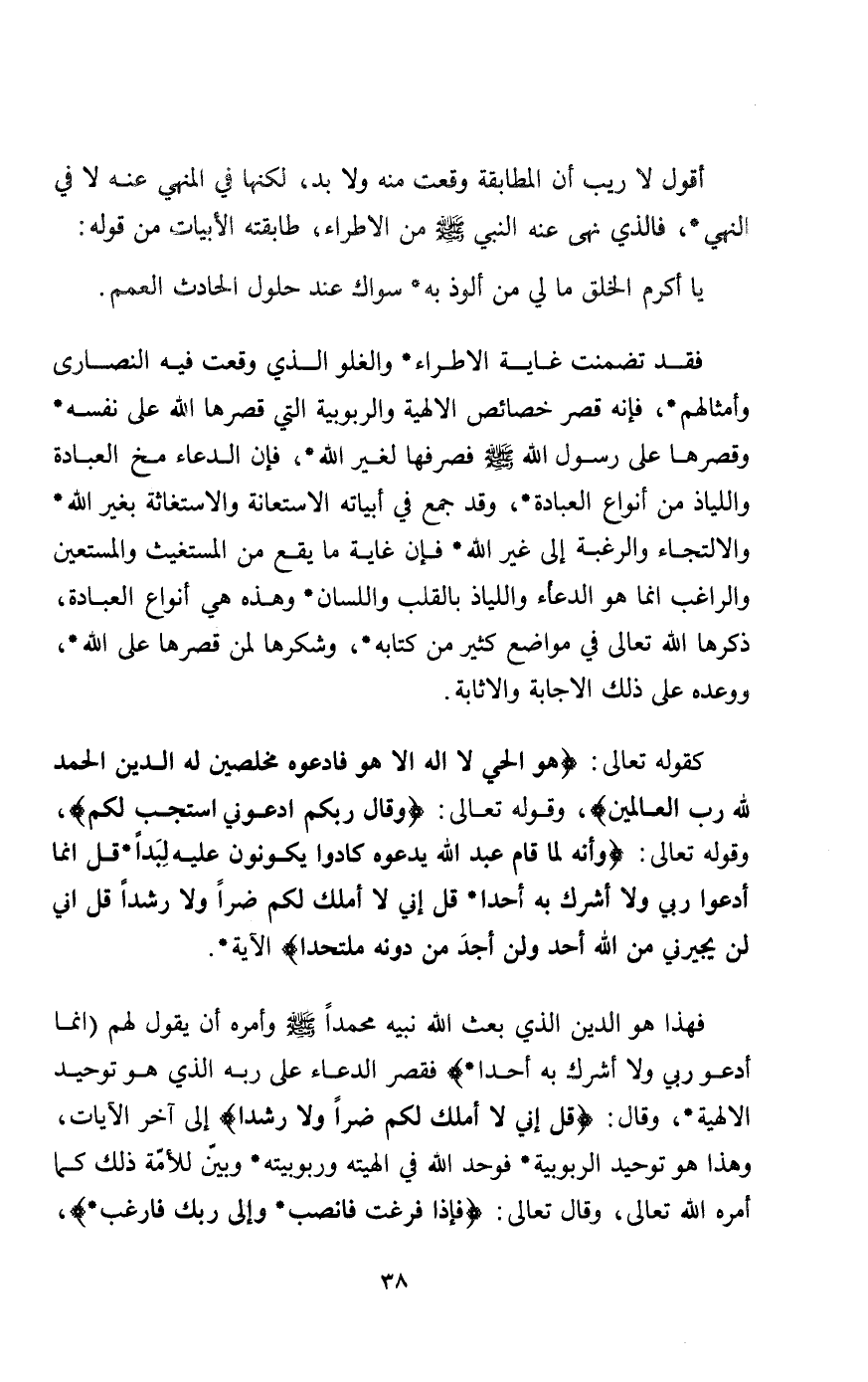 فهذا هو الدين الذي بعث الله نبيه محمد صلى الله عليه وسلم وأمره أن يقول لهم {إِنَّمَا أَدْعُو رَبِّي وَلا أُشْرِكُ بِهِ أَحَداً} فقصر الدعاء على ربه الذي هو توحيد الالهية وقال: {قُلْ إِنِّي لا أَمْلِكُ لَكُمْ ضَرّاً وَلا رَشَداً} إلى آخر الآيات وهذا هو توحيد الربوبية فوحد الله في الهيته وربوبيته وبين للأمة ذلك كما أمره الله تعالى وقال تعالى: {فَإِذَا فَرَغْتَ فَانْصَبْ وَإِلَى رَبِّكَ فَارْغَبْ} ,