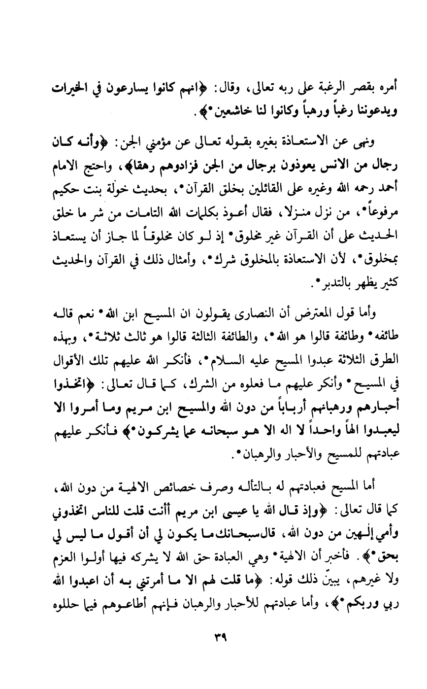 ونهى عن الاستعاذة بغيره بقوله تعالى عن مؤمني الجن: {وَأَنَّهُ كَانَ رِجَالٌ مِنَ الْأِنْسِ يَعُوذُونَ بِرِجَالٍ مِنَ الْجِنِّ فَزَادُوهُمْ رَهَقاً} واحتج الامام أحمد رحمه الله: وغيره على القائلين بخلق القرآن بحديث خولة بنت حكيم مرفوعا من نزل منزلا فقال أعوذ بكلمات الله التامات من شر ما خلق الحديث على أن القرآن غير مخلوق إذ لو كان مخلوقا لما جاز أن يستعاذ بمخلوق لأن الاستعاذة بالمخلوق شرك وأمثال ذلك في القرآن والحديث كثير يظهر بالتدبير.