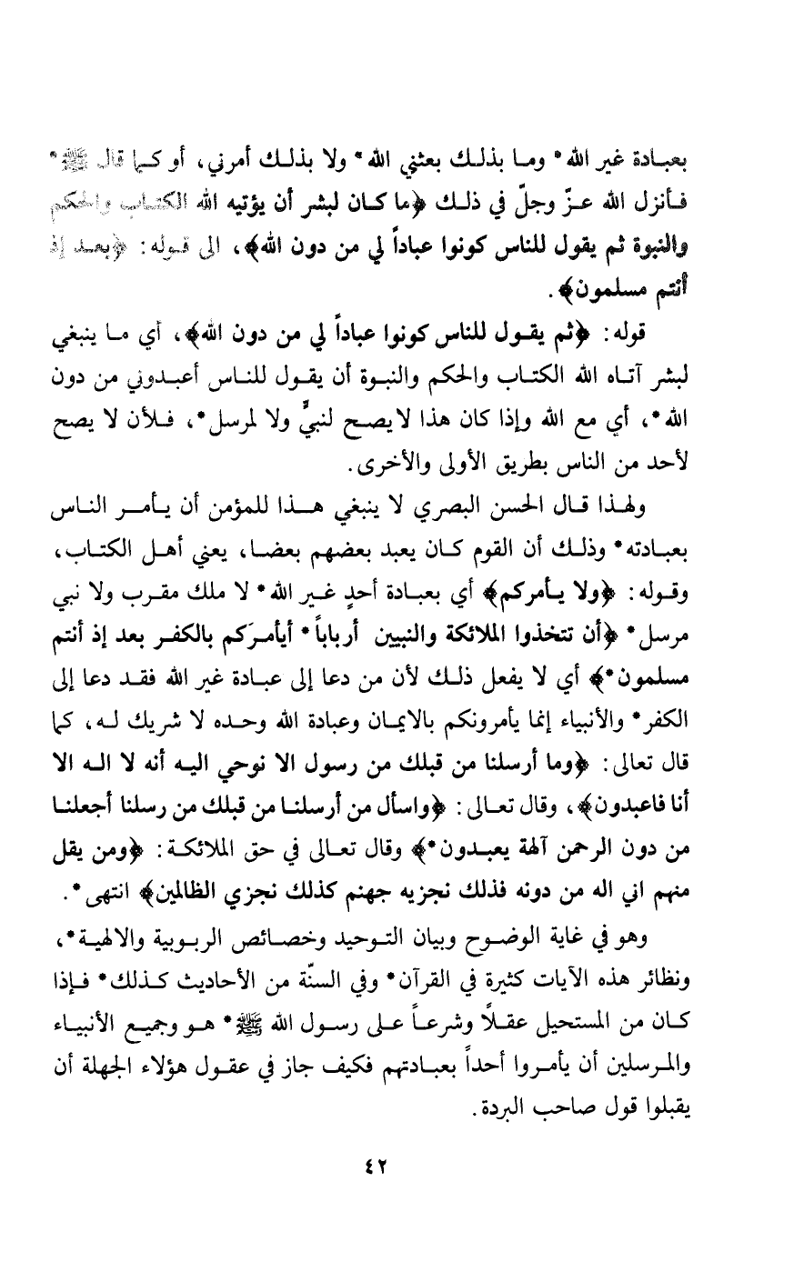 بعبادة غير الله وما بذلك بعثني الله ولا بذلك أمرني أو كما قال صلى الله عليه وسلم فأنزل الله عز وجل في ذلك {مَا كَانَ لِبَشَرٍ أَنْ يُؤْتِيَهُ اللَّهُ الْكِتَابَ وَالْحُكْمَ وَالنُّبُوَّةَ ثُمَّ يَقُولَ لِلنَّاسِ كُونُوا عِبَاداً لِي مِنْ دُونِ اللَّهِ} إلى قوله: {بَعْدَ إِذْ أَنْتُمْ مُسْلِمُونَ} .