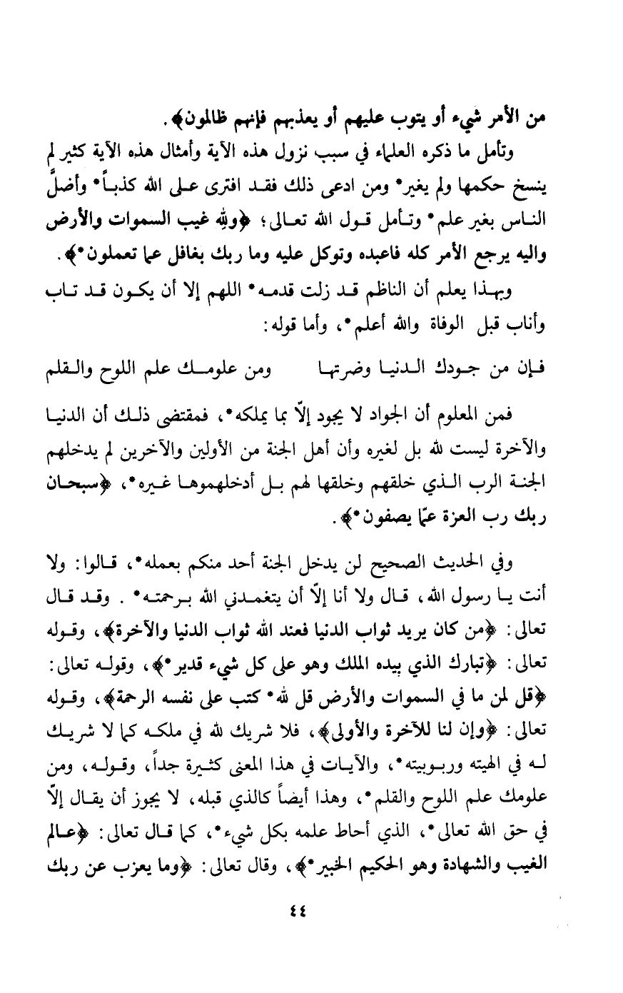 وفي الحديث الصحيح لن يدخل الجنة أحد منكم بعمله, قالوا ولا أنت يا رسول الله قال ولا أنا إلا أن يتغمدني الله برحمته وقد قال تعالى: {مَنْ كَانَ يُرِيدُ ثَوَابَ الدُّنْيَا فَعِنْدَ اللَّهِ ثَوَابُ الدُّنْيَا وَالْآخِرَةِ} وقوله تعالى: {تَبَارَكَ الَّذِي بِيَدِهِ الْمُلْكُ وَهُوَ عَلَى كُلِّ شَيْءٍ قَدِيرٌ} وقوله تعالى: {قُلْ لِمَنْ مَا فِي السَّمَاوَاتِ وَالْأَرْضِ قُلْ لِلَّهِ كَتَبَ عَلَى نَفْسِهِ الرَّحْمَةَ} وقوله تعالى: {وَإِنَّ لَنَا لَلْآخِرَةَ وَالْأُولَى} فلا شريك لله في ملكه كما لا شريك له في الهيته وربوبيته والآيات في هذا المعنى كثيرة جدا وقوله: ومن علومك علم اللوح والقلم وهذا أيضا كالذي قبله لا يجوز أن يقال إلا في حق الله تعالى الذي أحاط علمه بكل شيء كما قال تعالى: {عَالِمُ الْغَيْبِ وَالشَّهَادَةِ وَهُوَ الْحَكِيمُ الْخَبِيرُ} وقال تعالى: {وَمَا يَعْزُبُ عَنْ رَبِّكَ