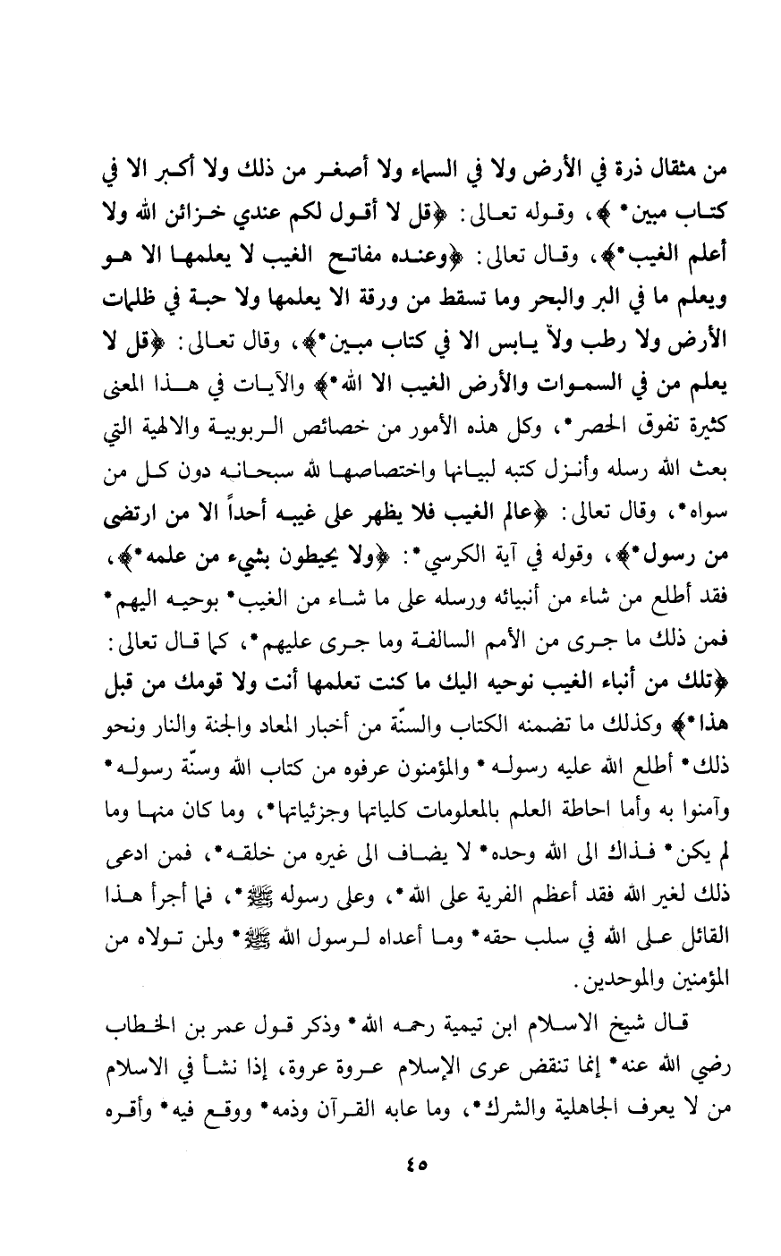 مِنْ مِثْقَالِ ذَرَّةٍ فِي الْأَرْضِ وَلا فِي السَّمَاءِ وَلا أَصْغَرَ مِنْ ذَلِكَ وَلا أَكْبَرَ إِلاَّ فِي كِتَابٍ مُبِينٍ} وقوله تعالى: {قُلْ لا أَقُولُ لَكُمْ عِنْدِي خَزَائِنُ اللَّهِ وَلا أَعْلَمُ الْغَيْبَ} وقال تعالى: {وَعِنْدَهُ مَفَاتِحُ الْغَيْبِ لا يَعْلَمُهَا إِلَّا هُوَ وَيَعْلَمُ مَا فِي الْبَرِّ وَالْبَحْرِ وَمَا تَسْقُطُ مِنْ وَرَقَةٍ إِلَّا يَعْلَمُهَا وَلا حَبَّةٍ فِي ظُلُمَاتِ الْأَرْضِ وَلا رَطْبٍ وَلا يَابِسٍ إِلَّا فِي كِتَابٍ مُبِينٍ} وقال تعالى: {قُلْ لا يَعْلَمُ مَنْ فِي السَّمَاوَاتِ وَالْأَرْضِ الْغَيْبَ إِلَّا اللَّهُ} والآيات في هذا المعنى كثيرة تفوق الحصر وكل هذه الأمور من خصائص الربوبية والإلهية ألتي بعث الله رسله وأنزل كتبه لبيانها واختصاصها لله سبحانه دون كل من سواه وقال تعالى: {عَالِمُ الْغَيْبِ فَلا يُظْهِرُ عَلَى غَيْبِهِ أَحَداً إِلَّا مَنِ ارْتَضَى مِنْ رَسُولٍ} وقوله في آية الكرسي: {وَلا يُحِيطُونَ بِشَيْءٍ مِنْ عِلْمِهِ} فقد أطلع من شاء من أنبيائه ورسله على ماشاء من الغيب بوحيه إليهم فمن ذلك ما جرى من الأمم السالفة وما جرى عليهم كما قال تعالى: {تِلْكَ مِنْ أَنْبَاءِ الْغَيْبِ نُوحِيهَا إِلَيْكَ مَا كُنْتَ تَعْلَمُهَا أَنْتَ وَلا قَوْمُكَ مِنْ قَبْلِ هَذَا} وكذلك ما تضمنه الكتاب والسنة من أخبار المعاد والجنة والنار ونحو ذلك أطلع الله عليه رسوله والمؤمنين عرفوه من كتاب الله وسنة رسوله وآمنوا به وأما إحاطة العلم بالمعلومات كلياتها وجزئياتها وما كان منها وما وما لم يكن فذاك إلى الله وحده لا يضاف إلى غيره من خلقه فمن ادعى ذلك لغير الله فقد أعظم الفرية على الله وعلى رسوله صلى الله عليه وسلم فما أجرأ هذا القاتل على الله في سلب حقه وما أعداه لرسول الله صلى الله عليه وسلم ولمن تولاه من المؤمنين والموحدين.