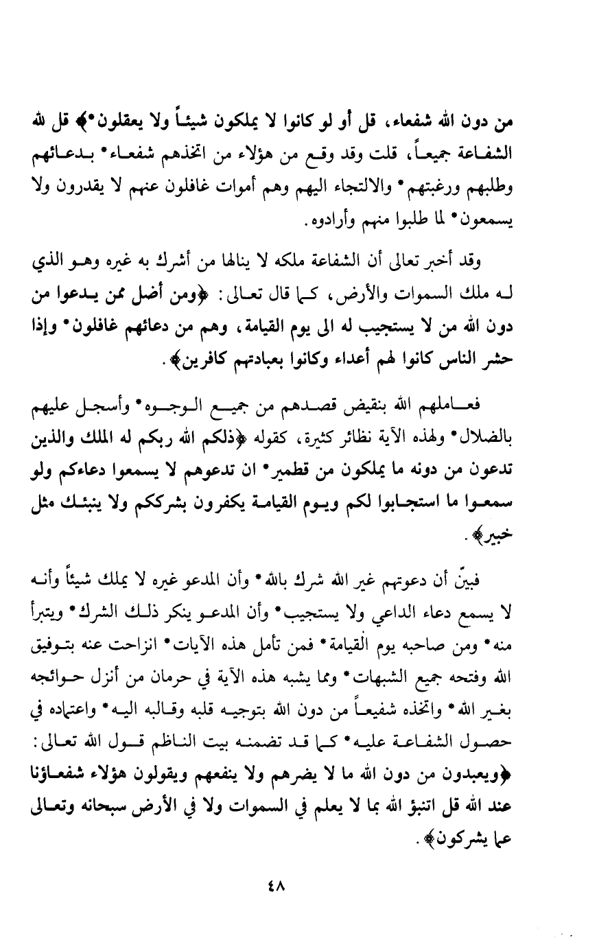 فبين أن دعوتهم غير الله شرك بالله وأن المدعو غيره لا يملك شيئا وأنه لا يسمع دعاء الداعي ولا يستجيب وأن المدعو ينكر ذلك الشرك ويتبرأ منه ومن صاحبه يوم القيامة فمن تأمل هذه الآيات انزاحت عنه بتوفيق الله وفتحه جميع الشبهات ومما يشبه هذه الآية في حرمان من أنزل حوائجه بغير الله واتخذه شفيعا من دون الله بتوجيه قلبه وقالبه إليه واعتماده في حصول الشفاعة عليه كما قد تضمنه بيت الناظم قول الله تعالى: {وَيَعْبُدُونَ مِنْ دُونِ اللَّهِ مَا لا يَضُرُّهُمْ وَلا يَنْفَعُهُمْ وَيَقُولُونَ هَؤُلاءِ شُفَعَاؤُنَا عِنْدَ اللَّهِ قُلْ أَتُنَبِّئُونَ اللَّهَ بِمَا لا يَعْلَمُ فِي السَّمَاوَاتِ وَلا فِي الْأَرْضِ سُبْحَانَهُ وَتَعَالَى عَمَّا يُشْرِكُونَ} .