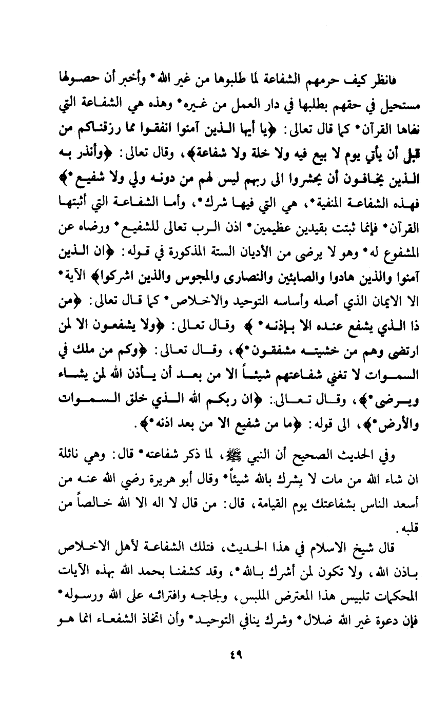 وفي الحديث الصحيح أن النبي صلى الله عليه وسلم لما ذكر شفاعته قال: "وهي نائلة إن شاء الله من مات لا يشرك بالله شيئا" وقال أبو هريرة رضي الله عنه من أسعد الناس بشفاعتك يوم القيامة قال: "من قال لا إله إلا الله خالصا من قلبه".