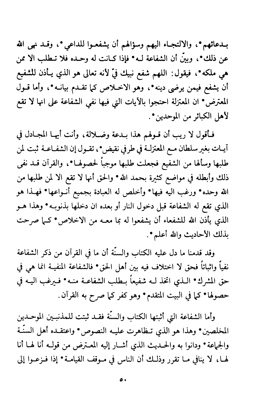 فأقول لاريب أن قولهم: هذا بدعة وضلالة وأنت أيها المجادل في آيات بغير سلطان مع المعتزلة في طرفي نقيض تقول إن الشفاعة ثبت لمن طلبها وسألها من الشفيع فجعلت طلبها موجبا لحصولها والقرآن قد نفى ذلك وأبطله في مواضع كثيرة بحمد الله والحق أنها لا تقع إلا لمن طلبها من الله وحده ورغب إليه فيها وأخلص له العبادة بجميع أنواعها فهذا هو الذي تقع له للشفاعة قبل دخول النار أو بعده أن دخلها بذنوبه وهذا هو الذي يأذن الله للشفعاء أن يشفعوا له بما معه من الا خلاص كما صرحت بذلك الأحاديث والله أعلم.