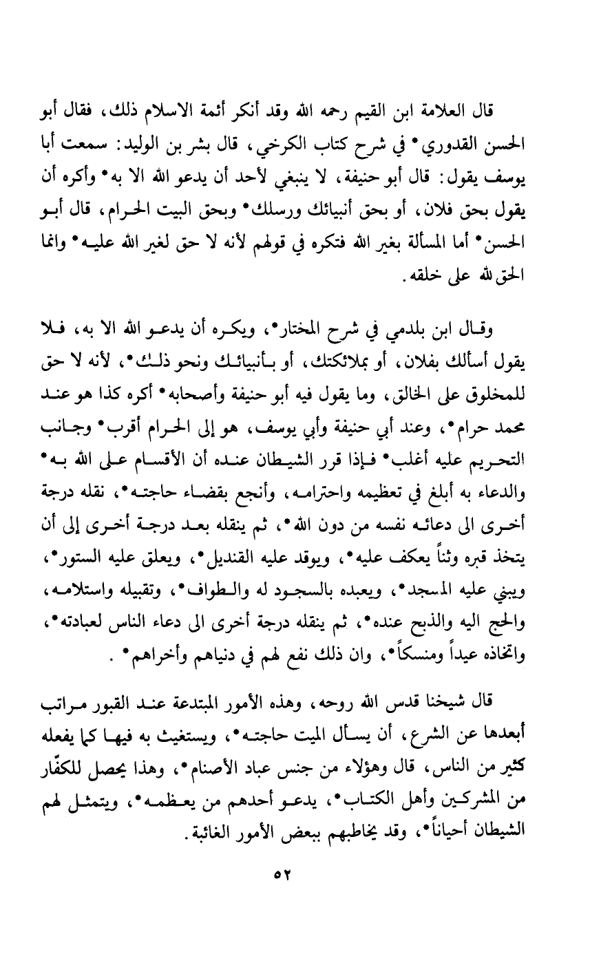 وقال ابن بلدمي في شرح المختار ويكره أن يدعوا الله إلا به فلا يقول أسألك بفلان أو بملائكتك أو بأنبيائك ونحو ذلك لأنه لاحق للمخلوق على الخالق وما يقول فيه أبو حنيفة وأصحابه أكره كذا هو عند محمد حرام وعند أبي حنيفة وأبي يوسف هو إلى الحرام أقرب وجانب التحريم عليه أغلب فإذا قرر الشيطان عنده أن الأقسام على الله به والدعاء به أبلغ في تعظيمه واحترامه وأنجع بقضاء حاجته نقله درجة أخرى إلى دعائه نفسه من دون الله ثم ينقله بعد درجة أخرى إلى أن يتخذ قبره وثنا يعكف عليه ويوقد عليه القنديل ويعلق عليه الستور ويبني عليه المسجد ويعبده بالسجود له والطواف وتقبيله واستلامه والحج إليه والذبح عنده ثم ينقله درجة أخرى إلى دعاء الناس لعبادته واتخاذه عيدا ومنسكا وإن ذلك نفع لهم في دنياهم وأخراهم.