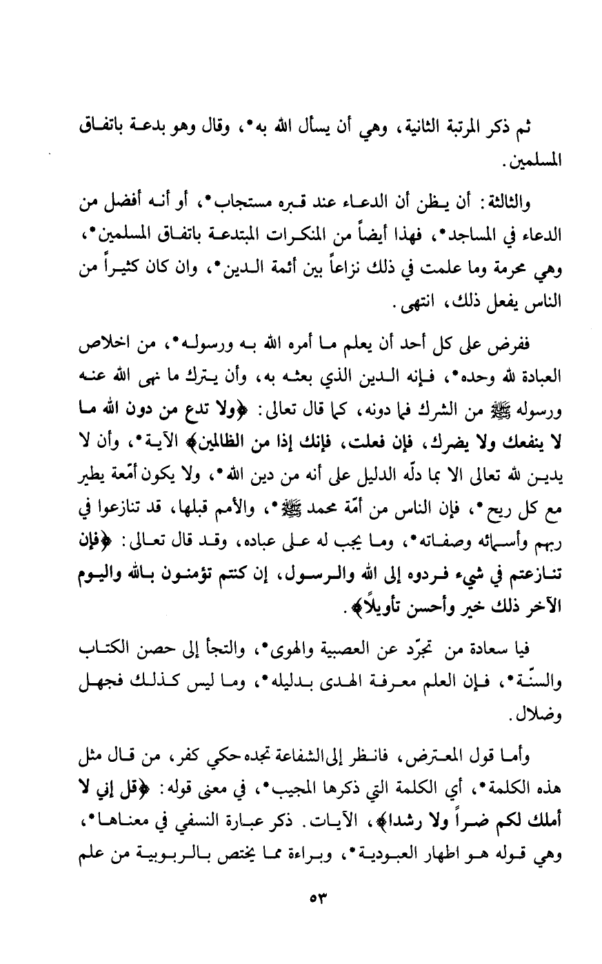 َ {لا تَدْعُ مِنْ دُونِ اللَّهِ مَا لا يَنْفَعُكَ وَلا يَضُرُّكَ فَإِنْ فَعَلْتَ فَإِنَّكَ إِذاً مِنَ الظَّالِمِينَ} الآية وأن لا يدين لله تعالى إلا بما دل له الدليل على أنه من دين الله ولا يكون أمعة يطير مع كل ريح فإن الناس من أمة محمد صلى الله عليه وسلم والأمم قبلها قد تنازعوا في ربهم وأسمائه وصفاته وما يجب له على عباده وقد قال تعالى: {فَإِنْ تَنَازَعْتُمْ فِي شَيْءٍ فَرُدُّوهُ إِلَى اللَّهِ وَالرَّسُولِ إِنْ كُنْتُمْ تُؤْمِنُونَ بِاللَّهِ وَالْيَوْمِ الْآخِرِ ذَلِكَ خَيْرٌ وَأَحْسَنُ تَأْوِيلاً} .