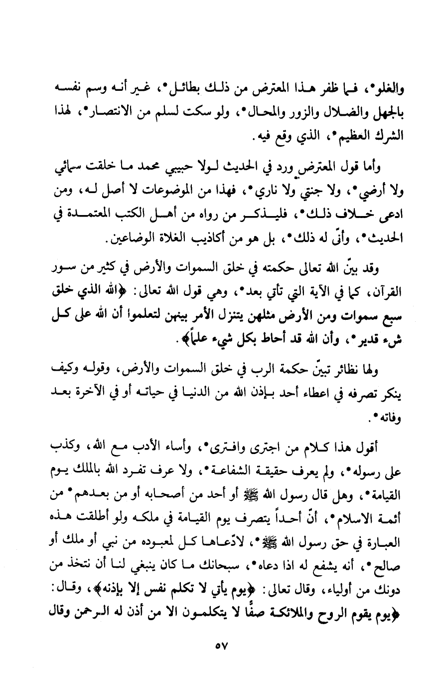 والغلو فما ظفر هذا المعترض من ذلك بطائل غير أنه وسم نفسه بالجهل والضلال والزور والمحال لوسكت لسلم من الانتصار لهذا من الشرك العظيم الذب وقع فيه. وأما قول المعترض ورد في الحديث "لولا حبيبي محمد ما خلق سمائي ولا أرضي ولا ناري" فهذا من الموضوعات لا أصل له ومن ادعى خلاف ذلك فليذكر من رواه من أهل الكتب المعتمدة في الحديث وأنى له ذلك بل هو من أكاذيب الغلاة الوضاعين.