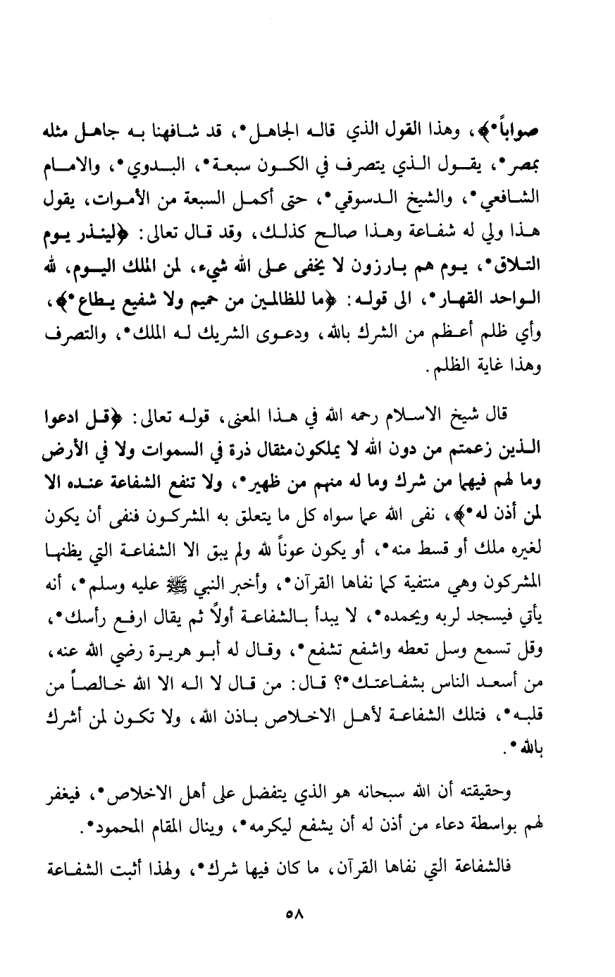 قال شيخ الإسلام رحمه الله: في هذا المعنى قوله تعالى: ِ {قُلِ دْعُوا الَّذِينَ زَعَمْتُمْ مِنْ دُونِ اللَّهِ لا يَمْلِكُونَ مِثْقَالَ ذَرَّةٍ فِي السَّمَاوَاتِ وَلا فِي الْأَرْضِ وَمَا لَهُمْ فِيهِمَا مِنْ شِرْكٍ وَمَا لَهُ مِنْهُمْ مِنْ ظَهِير وَلا تَنْفَعُ الشَّفَاعَةُ عِنْدَهُ إِلَّا لِمَنْ أَذِنَ لَهُ} نفى الله عما سواه كل ما يتعلق به المشركون فنفى أن يكون لغيره ملك أو قسط منه أو يكون عونا الله ولم يبق إلا الشفاعة التي يظنها المشركون وهي منتفية كما نفاها القرآن وأخبر النبي صلى الله عليه وسلم عليه وسلم أنه يأتي فيسجد لربه ويحمده لا يبدأ بالشفاعة أولا ثم يقال ارفع رأسك وقل تسمع وسل تعطه واشفع تشفع وقال له أبو هريرة رضي الله عنه من أسعد الناس بشفاعتك قال: "من قال لا إله إلا الله خالصا من قلبه فتلك الشفاعة لأهل الإخلاص بإذن الله ولا تكون لمن أشرك بالله":