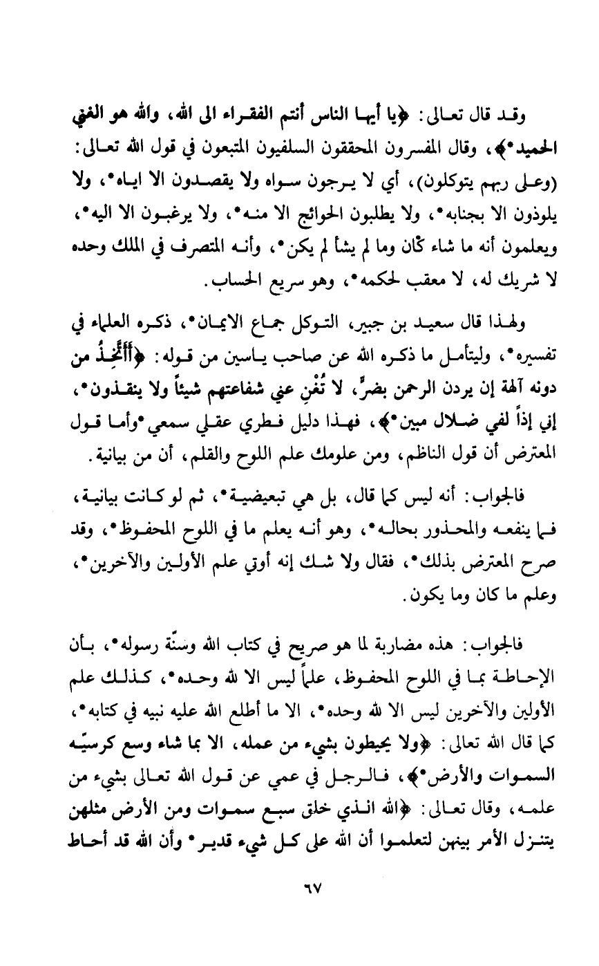 وقد قال تعالى: {يَا أَيُّهَا النَّاسُ أَنْتُمُ الْفُقَرَاءُ إِلَى اللَّهِ وَاللَّهُ هُوَ الْغَنِيُّ الْحَمِيدُ} وقال المفسرون المحققون السلفيون المتبعون في قول الله تعالى: {وَعَلَى رَبِّهِمْ يَتَوَكَّلُونَ} أي لا يرجون سواه ولا يقصدون إلا إياه ولا يلوذون إلا بجنابه ولا يطلبون الحوائج إلا منه ولا يرغبون إلا إليه ويعلمون أنه ما شاء كان وما لم يشاء لم يكن وأنه المتصرف في الملك وحده لا شريك له لا معقب لحكمه وهو سريع الحساب.