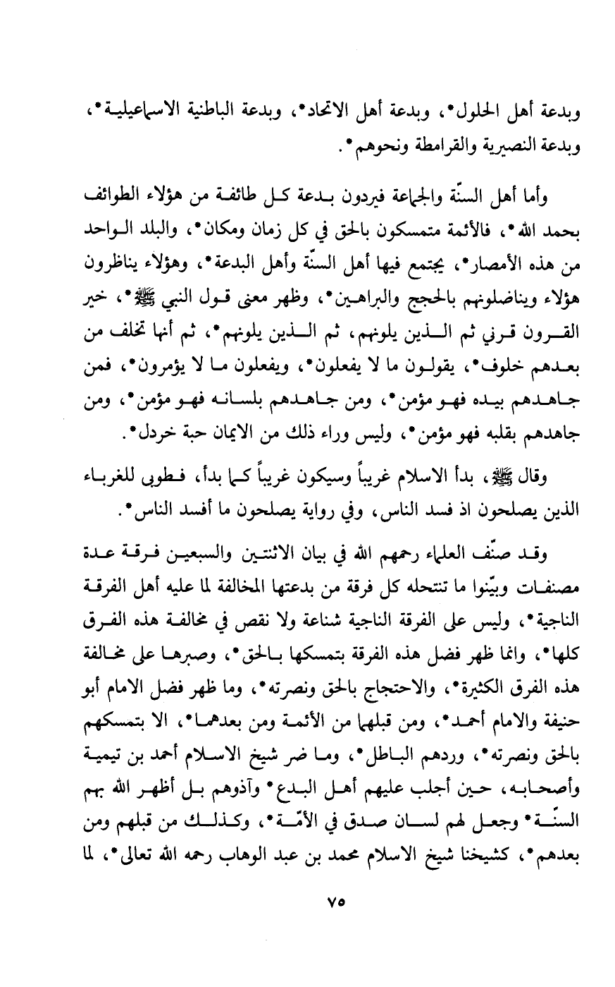 وقد صنف العلماء رحمهم الله في بيان الاثنتين والسبعين فرقة عدة مصنفات وبينوا ما تنتحله كل فرقة من بدعتها المخالفة لما عليه أهل الفرقة الناجية وليس على الفرقة الناجية شناعة ولا نقص في مخالفة هذه الفرق كلها وإنما ظهر فضل هذه الفرقة بتمسكها بالحق وصبرها على مخالفة هذه الفرق الكثيرة والاحتجاج بالحق ونصرته وما ظهر فضل الإمام أبو حنيفة والإمام أحمد ومن قبلهما من الأئمة ومن بعدهما إلا بتمسكهم بالحق ونصرته وردهم الباطل وما ضر شيخ الإسلام أحمد بن تيمية وأصحابه حين أجلب عليهم أهل البدع وآذوهم بل أظهر الله بهم السنة وجعل لهم لسان صدق في الأمة وكذلك من قبلهم ومن بعدهم كشيخنا شيخ الإسلام محمد بن عبد الوهاب رحمه الله تعالى: لما