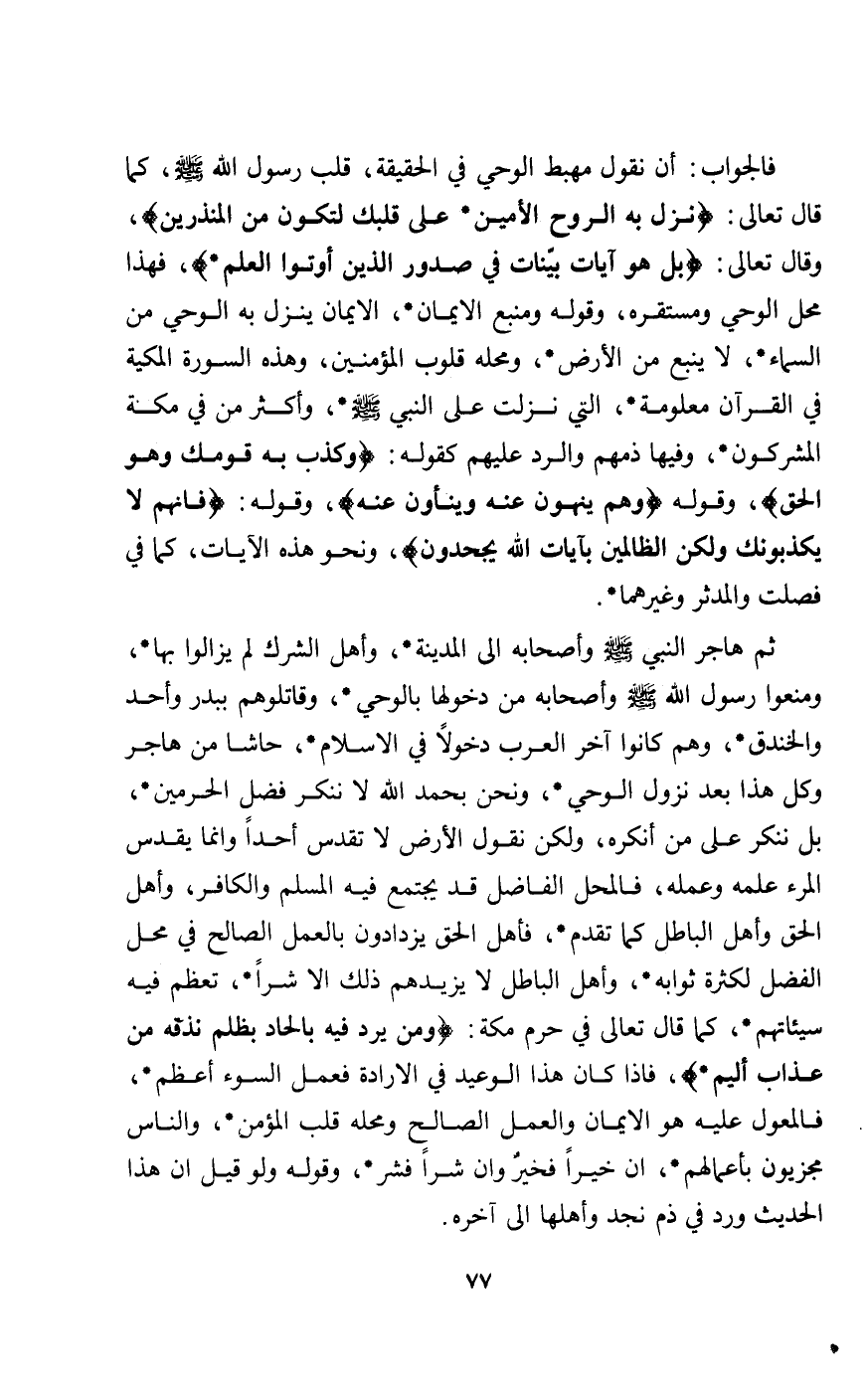 ثم هاجر النبي صلى الله عليه وسلم وأصحابه إلى المدينة وأهل الشرك لم يزالوا بها ومنعوا رسول الله صلى الله عليه وسلم وأصحابه من دخولها بالوحي وقاتلوهم ببدر وأحد والخندق وهم كانوا آخر العرب دخولا في الإسلام حاشا من جاهر وكل هذا بعد نزول الوحي ونحن بحمد الله لا ننكر فضل الحرمين بل ننكر على من أنكره ولكن نقول الأرض لا تقدس أحدا وإنما يقدس المرء علمه وعمله فالمحل الفاضل قد يجتمع فيه المسلم والكافر وأهل الحق وأهل الباطل كما تقدم فأهل الحق يزدادون بالعمل الصالح في محل الفضل لكثرة ثوابه وأهل الباطل لا يزيدهم ذلك إلا شرا تعظم فيه سيئاتهم كما قال تعالى: في حرم مكة {وَمَنْ يُرِدْ فِيهِ بِإِلْحَادٍ بِظُلْمٍ نُذِقْهُ مِنْ عَذَابٍ أَلِيمٍ} فإذا كان هذا الوعيد في الإرادة فعمل السوء أعظم فالمعول عليه هو الإيمان والعمل الصالح ومحله قلب المؤمن والناس مجزيون بأعمالهم إن خيرا فخيرا وإن شرا فشر وقوله: ولو قيل إن هذا الحديث ورد في ذم نجد وأهلها إلى آخره.