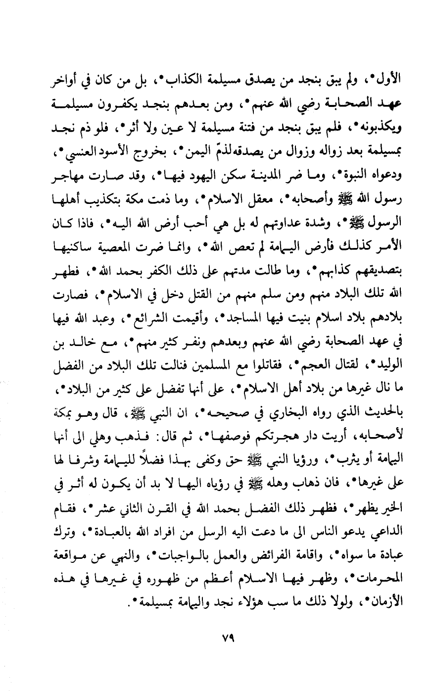 الأول ولم يبق بنجد من يصدق مسيلمة الكذاب بل من كن في أواخر عهد الصحابة رضي الله عنهم ومن بعدهم بند يكفرون مسيلمة ويكذبونه فلم يبق بنجد من فتنة مسيلمة لا عين ولا أثر فلو ذم نجد بمسيلمة بعد زواله وزوال من يصدقه لذم اليمن بخروج الأسود العنسي ودعواه النبوة وما ضر المدينة سكن اليهود فيها وقد صارت مهاجر رسول الله صلى الله عليه وسلم وأصحابه معقل الإسلام وما ذمت مكة بتكذيب أهلها الرسول صلى الله عليه وسلم وشدة عداوتهم له بل هي أحب أرض الله إليه فإذا كان الأمر كذلك فأرض اليمامة لم تعص الله وإنما ضرت المعصية ساكنيها بتصديقهم كذابهم وما طالت مدتهم على ذلك الكفر بحمد الله فطهر الله تلك البلاد منهم ومن سلم منهم من القتل دخل في الإسلام فصارت بلادهم بلاد إسلام بنيت فيها المساجد وأقيمت الشرائع وعبد الله فيها في عهد الصحابة رضي الله عنهم وبعدهم ونفر كثير منهم مع خالد بن الوليد لقتال العجم فقاتلوا مع المسلمين فنالت تلك البلاد من الفضل ما نال غيرها من بلاد أهل الإسلام على أنها تفضل على كثير من البلاد بالحديث الذي رواه البخاري في صحيحه أن النبي صلى الله عليه وسلم: قال وهو بمكة لأصحابه: "أرأيت دار هجرتكم" فوصفها ثم قال: فذهب وهلي إلى أنها اليمامة أو يثرب ورؤيا النبي صلى الله عليه وسلم حق وكفى بهذا فضلا لليمامة وشرفا لها على غيرها فإن ذهاب وهله صلى الله عليه وسلم في رؤياه إليها لا بد أن يكون له أثر في الخير يظهر فظهر ذلك الفضل بحمد الله في القرن الثاني عشر فقام الداعي يدعو الناس إلى ما دعت إليه الرسل من أفراد الله بالعبادة وترك عبادة ما سواه وإقامة الفرائض والعمل بالواجبات والنهي عن مواقعة المحرمات وظهر فيها الإسلام أعظم من ظهوره في غيرها في هذه الأزمان ولولا ذلك ما سب هؤلاء نجد واليمامة بمسيلمة.