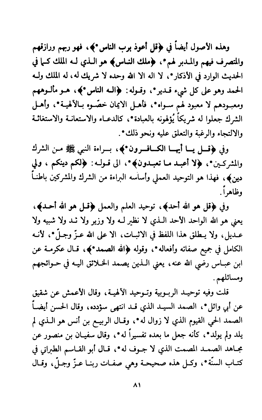 قلت: وفيه توحيد الربويبة وتوحيد الآلهية، وقال الأعمش عن شقيق عن أبي وائل، الصمد السيد الذي قد انتهى سؤدده، وقال الحسن أيضا: الصمد الحي القيوم الذي لا زوال له، وقال الربيع بن أنس: هو الذي لم يلد ولم يولد، كأن جعل ما بعده تفسيرا له، وقال سفيان بن منصور عن مجاهد: الصمد المصمت الذي لا جوف له، قال أبو القاسم الطبراني في كتاب السنة: وكل هذا صحيحة وهي صفات ربنا عز وجل، وقال