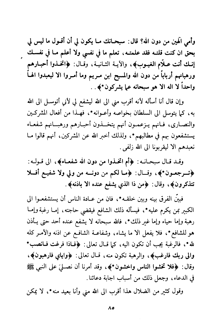 وَأُمِّيَ إِلَهَيْنِ مِنْ دُونِ اللَّهِ قَالَ سُبْحَانَكَ مَا يَكُونُ لِي أَنْ أَقُولَ مَا لَيْسَ لِي بِحَقٍّ إِنْ كُنْتُ قُلْتُهُ فَقَدْ عَلِمْتَهُ تَعْلَمُ مَا فِي نَفْسِي وَلا أَعْلَمُ مَا فِي نَفْسِكَ إِنَّكَ أَنْتَ عَلَّامُ الْغُيُوبِ} والآية الثانية وقال: {اتَّخَذُوا أَحْبَارَهُمْ وَرُهْبَانَهُمْ أَرْبَاباً مِنْ دُونِ اللَّهِ وَالْمَسِيحَ ابْنَ مَرْيَمَ وَمَا أُمِرُوا إِلَّا لِيَعْبُدُوا إِلَهاً وَاحِداً لا إِلَهَ إِلَّا هُوَ سُبْحَانَهُ عَمَّا يُشْرِكُونَ}