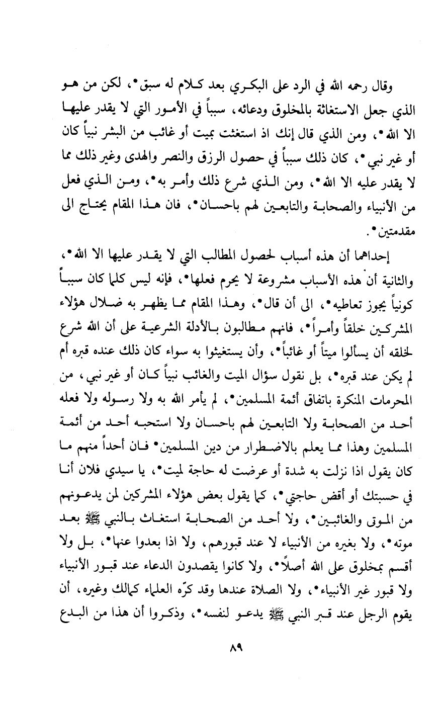 وقال رحمه الله: في الرد على البكري بعد كلام له سبق لكن من هو الذي جعل الاستغاثة بالمخلوق ودعائه سببا في الأمور التي لا يقدر عليها إلا الله ومن الذي قال إنك إذ استغثت بميت أو غائب من البشر نبيا كان أو غير نبي كان ذلك سببا في حصول الرزق والنصر والهدى وغير ذلك مما لا يقدر عليه إلا الله ومن الذي شرع ذلك وأمر به ومن الذي فعل من الأنبياء والصحابة والتابعين لهم بإحسان فإن هذا المقام يحتاج إلى مقدمتين