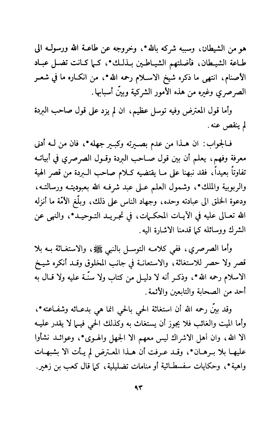 فالجواب: إن هذا من عدم بصيرته وكبير جهله فإن من له أدنى معرفة وفهم يعلم أن بين قول صاحب البردة وقول الصرصري في أبياته تفاوتا بعيدا فقد نبهنا على ما يقتضيه كلام صاحب البردة من قصر الهية والربوبية والملك وشمول العلم على عبد شرفه الله بعبوديته ورسالته ودعوة الخلق إلى عبادته وحده وجهاد الناس على ذلك وبلغ الأمة ما أنزله الله تعالى عليه في الآيات المحكمات في تجريد التوحيد والنهي عن الشرك ووسائله كما قدمنا الإشارة إليه.