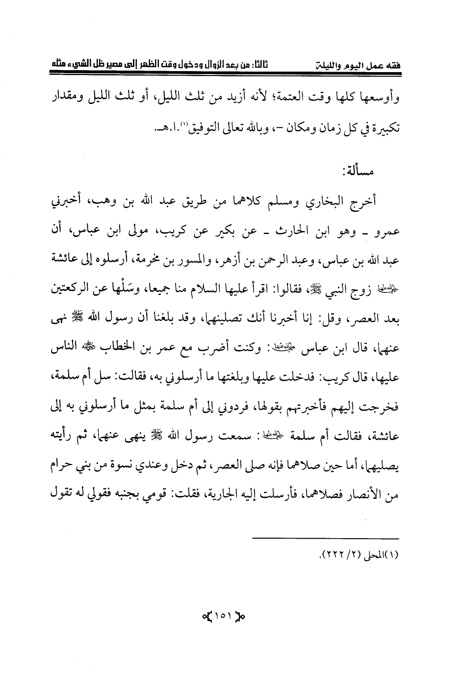 أخرج البخاري ومسلم كلاهما من طريق عبد الله بن وهب، أخبرني عمرو - وهو ابن الحارث - عن بكير عن كريب، مولى ابن عباس، أن عبد الله بن عباس، وعبد الرحمن بن أزهر، والمسور بن مخرمة، أرسلوه إلى عائشة - رضي الله عنها - زوج النبي - صلى الله عليه وسلم -، فقالوا: اقرأ عليها السلام منا جميعا، وسَلْها عن الركعتين بعد العصر، وقل: إنا أخبرنا أنك تصلينهما، وقد بلغنا أن رسول الله - صلى الله عليه وسلم - نهى عنهما، قال ابن عباس - رضي الله عنهما -: وكنت أضرب مع عمر بن الخطاب - رضي الله عنه - الناس عليها، قال كريب: فدخلت عليها وبلغتها ما أرسلوني به، فقالت: سل أم سلمة، فخرجت إليهم فأخبرتهم بقولها، فردوني إلى أم سلمة بمثل ما أرسلوني به إلى عائشة، فقالت أم سلمة - رضي الله عنها -: سمعت رسول الله - صلى الله عليه وسلم - ينهى عنهما، ثم رأيته يصليهما، أما حين صلاهما فإنه صلى العصر، ثم دخل وعندي نسوة من بني حرام من الأنصار فصلاهما، فأرسلت إليه الجارية، فقلت: قومي بجنبه فقولي له تقول