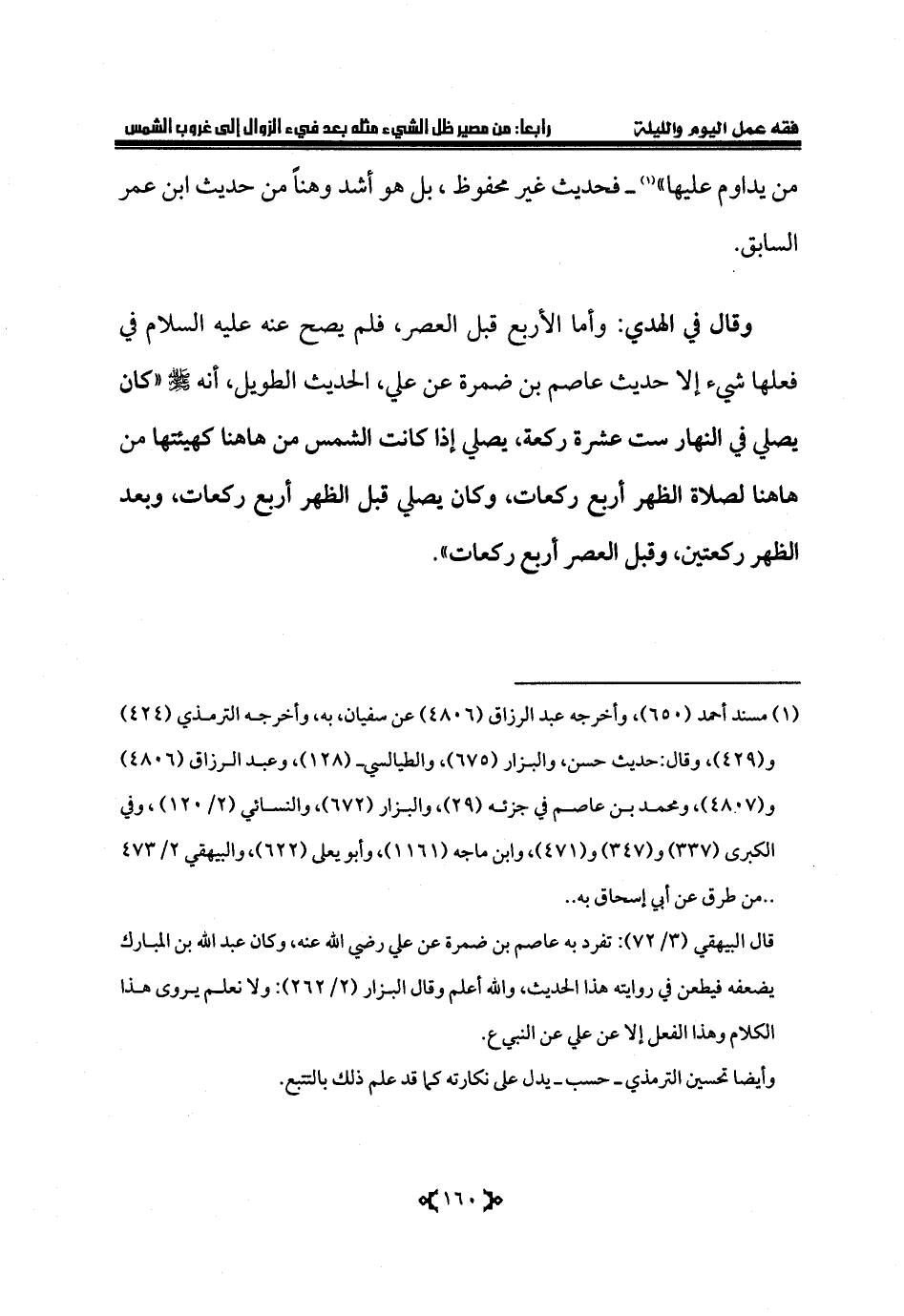 وقال في الهدي: وأما الأربع قبل العصر، فلم يصح عنه عليه السلام في فعلها شيء إلا حديث عاصم بن ضمرة عن علي، الحديث الطويل، أنه - صلى الله عليه وسلم - «كان يصلي في النهار ست عشرة ركعة، يصلي إذا كانت الشمس من هاهنا كهيئتها من هاهنا لصلاة الظهر أربع ركعات، وكان يصلي قبل الظهر أربع ركعات، وبعد الظهر ركعتين، وقبل العصر أربع ركعات».