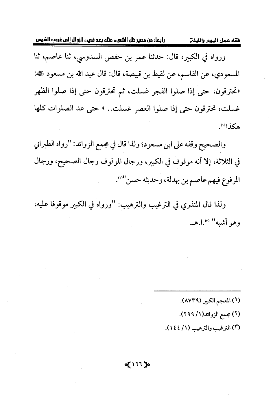 ورواه في الكبير، قال: حدثنا عمر بن حفص السدوسي، ثنا عاصم، ثنا المسعودي، عن القاسم، عن لقيط بن قبيصة، قال: قال عبد الله بن مسعود - رضي الله عنه -: «تحترقون، حتى إذا صلوا الفجر غسلت، ثم تحترقون حتى إذا صلوا الظهر غسلت، تحترقون حتى إذا صلوا العصر غسلت ..» حتى عد الصلوات كلها هكذا (¬1).