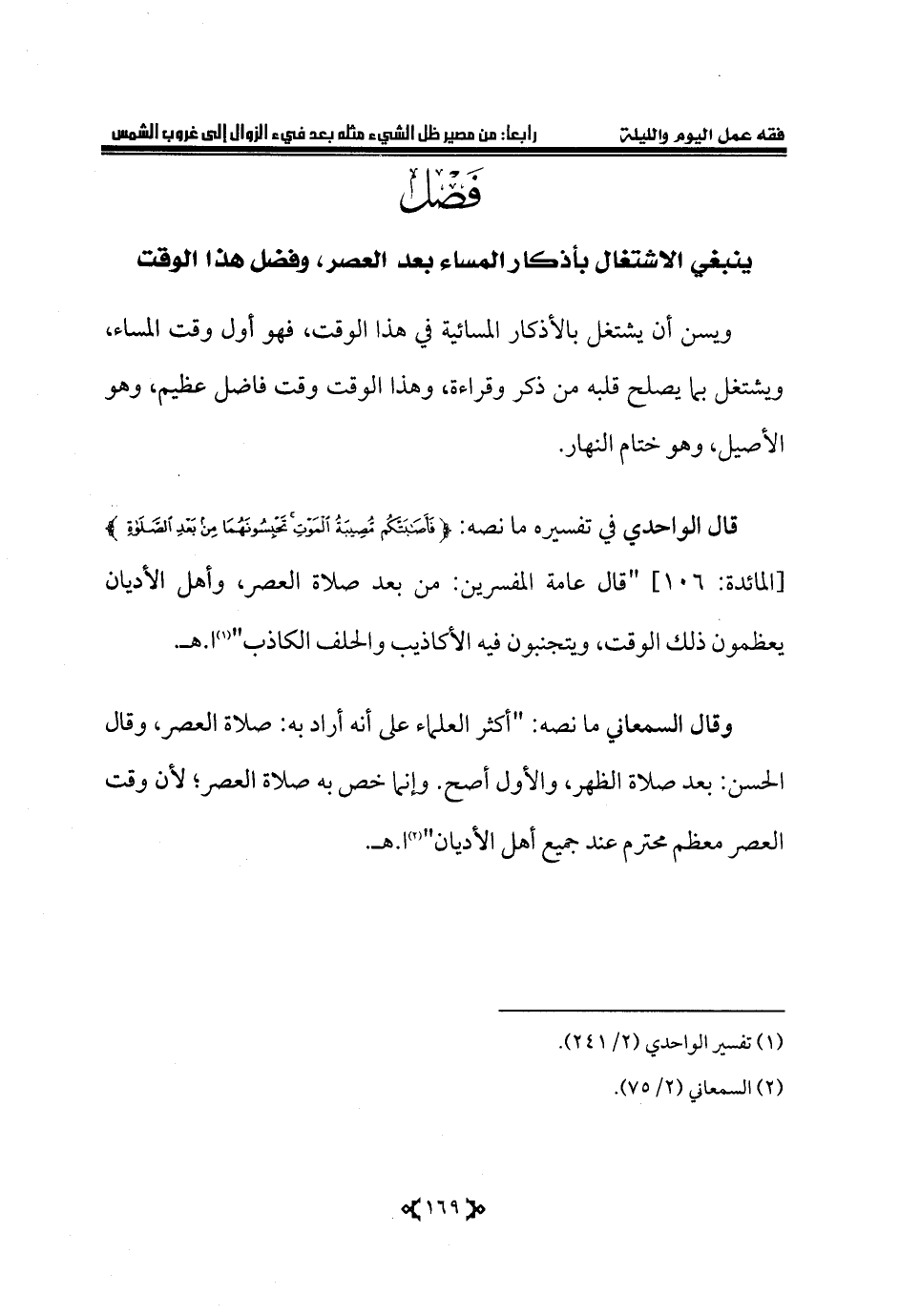 قال الواحدي في تفسيره ما نصه: {فَأَصَابَتْكُمْ مُصِيبَةُ الْمَوْتِ تَحْبِسُونَهُمَا مِنْ بَعْدِ الصَّلَاةِ} [المائدة: 106] "قال عامة المفسرين: من بعد صلاة العصر، وأهل الأديان يعظمون ذلك الوقت، ويتجنبون فيه الأكاذيب والحلف الكاذب" (¬1) ا. هـ.
